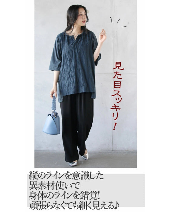 ゆるっとラフなのに縦のラインを意識した異素材使いで身体のラインを錯覚!落ち感もありスッキリ見えるシルエット♪こちらの商品は、柄やモチーフの配置に