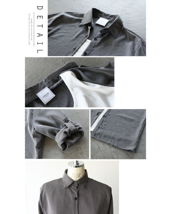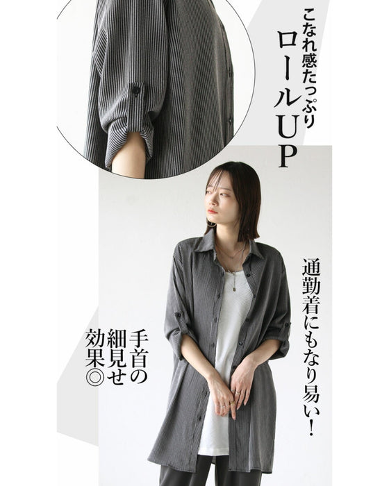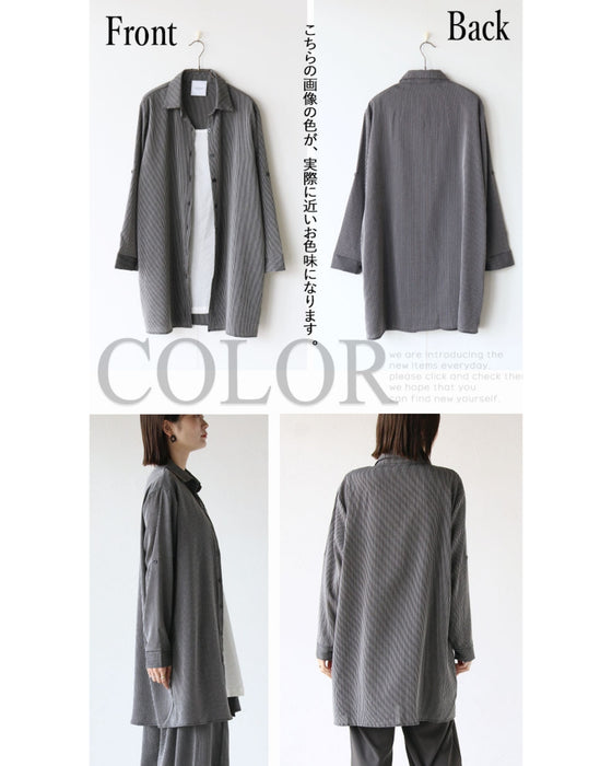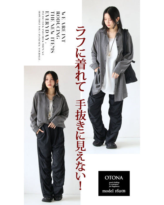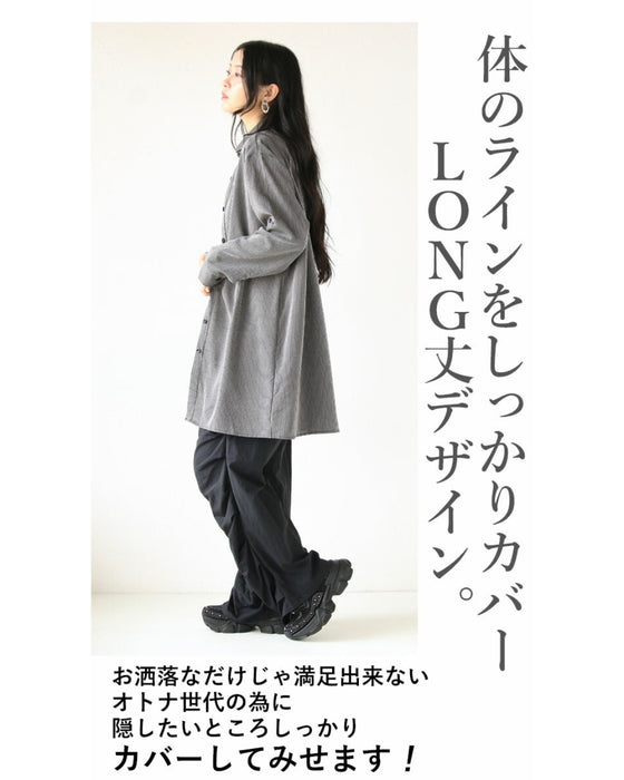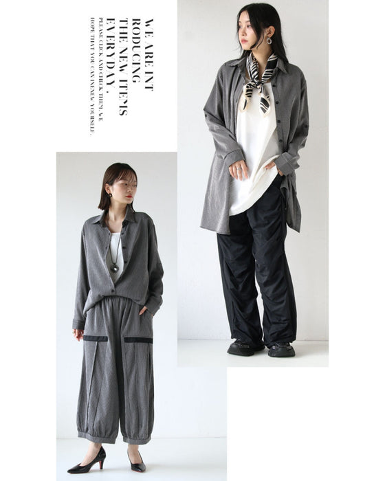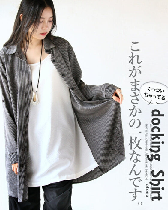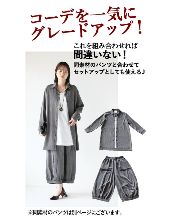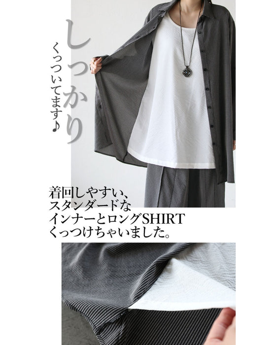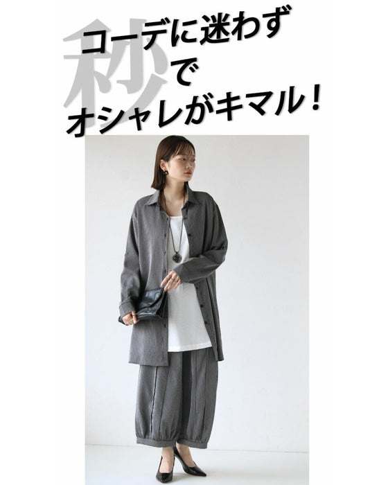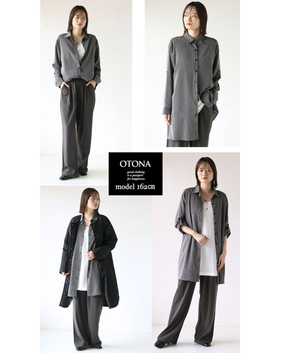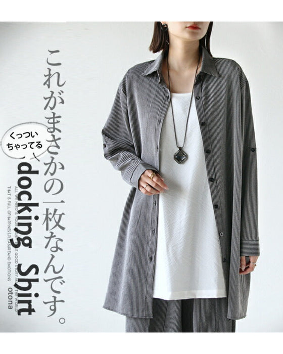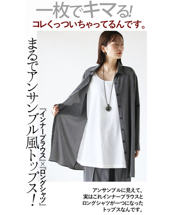 アンサンブルに見えて、実はこれインナーブラウスとロングシャツが一つになったドッキングデザインだからアレコレ組み合わせを考える必要なし!