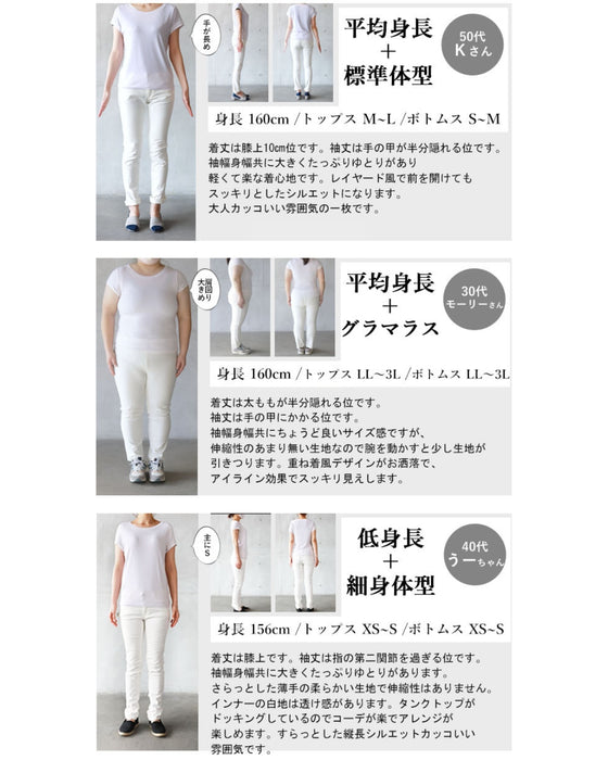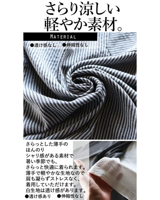 さらっとした薄手のほんのりシャリ感がある素材で暑い季節でも、さらっと快適に着られます。薄手で軽やかな生地なので肩も凝らずストレスなく、着用していただけます。白生地は透け感があります。