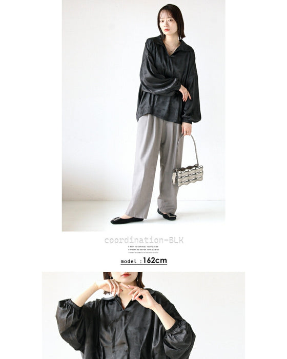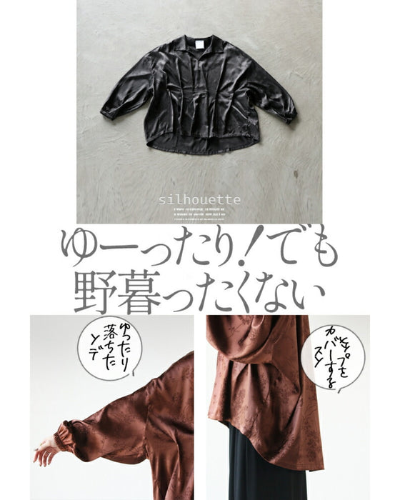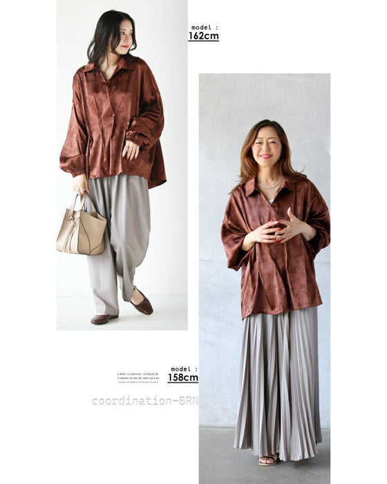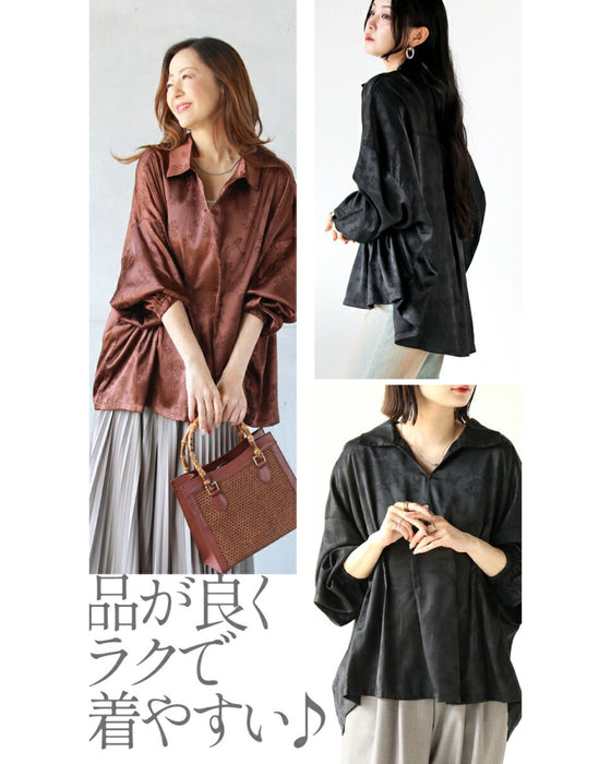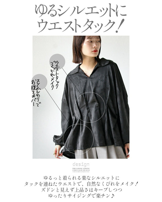 ブラックとブラウン2色展開の大人ブラウス。ウエスト部分にタックを入れ、自然とシェイプされたシルエットに。お腹周りをカバーし、すっきり魅せられるけど着心地はとてもゆったりラク!