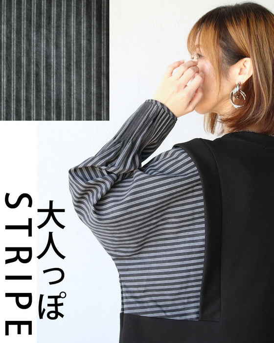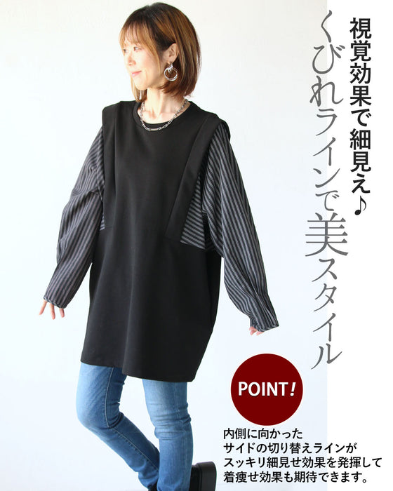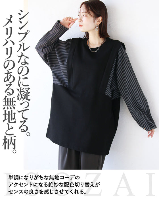 ■単調になりがちな無地コーデのアクセントになる絶妙な配色切り替えがセンスの良さを感じさせてくれる。シンプルなのに凝ってる メリハリのある無地と柄。一枚なのにレイヤード風デザインの異素材チュニックトップス。