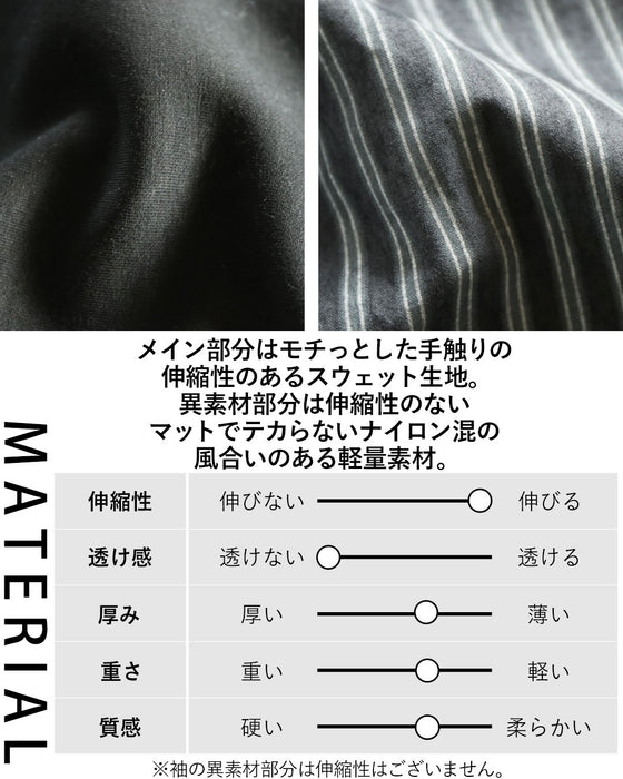 ■メイン部分はモチっとした手触りの伸縮性のあるスウェット生地。異素材部分は伸縮性のないマットでテカらないナイロン混の風合いのある軽量素材。