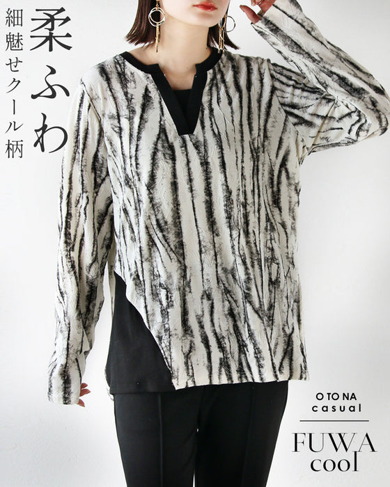 染風のランダムストライプでモード感を。さりげないリーフのエンボス柄が奥行を演出します。 サイドのスリット風生地の配置と、胸元のVネックでスッキリ細魅せ効果も♪