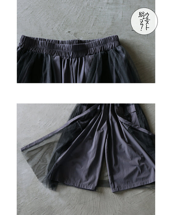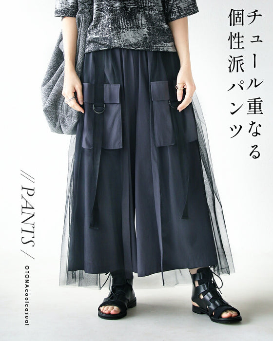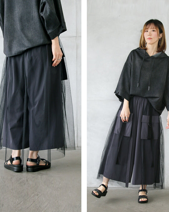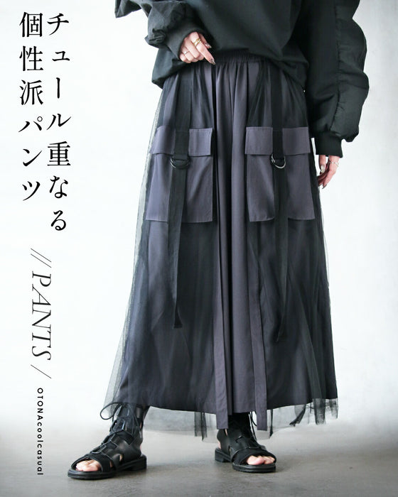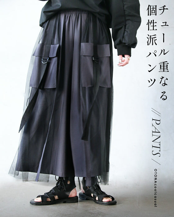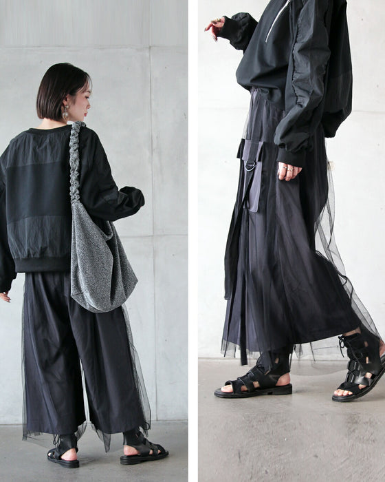 ■カジュアルなナイロンパンツに重なる甘チュール。他にはない個性的なデザインパンツです。