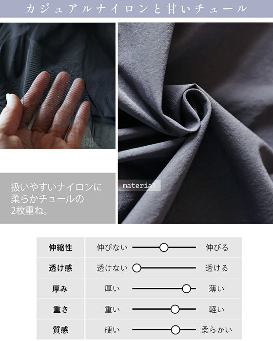 扱いやすく、マットで光沢感を抑えた品のある生地感です。チュールは柔らかくごわつきません。