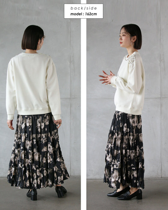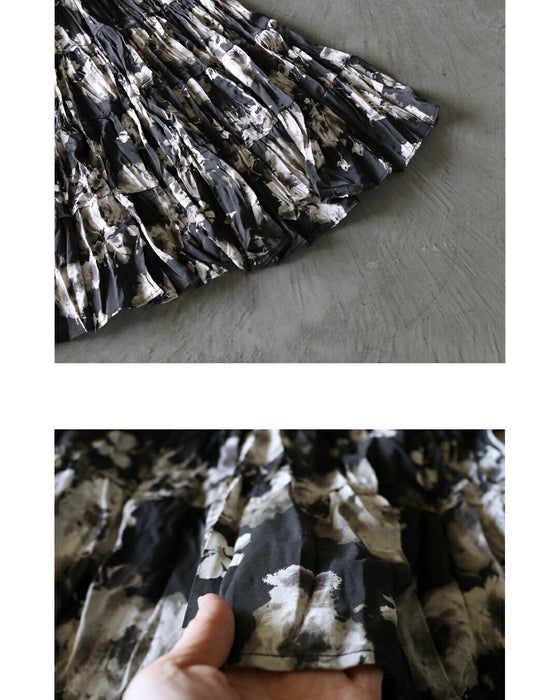 甘くならない大人っぽい柄と、ふわりと広がる何段にも重なるギャザーで程よくフェミニンに。