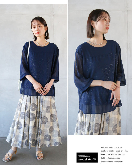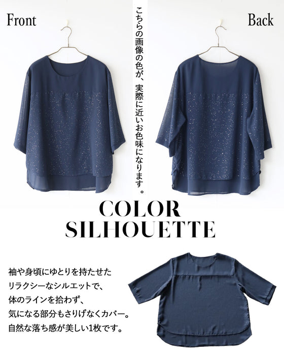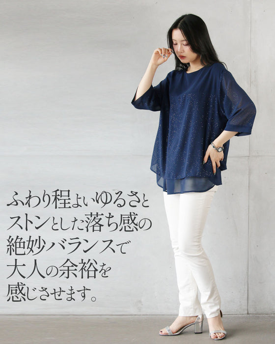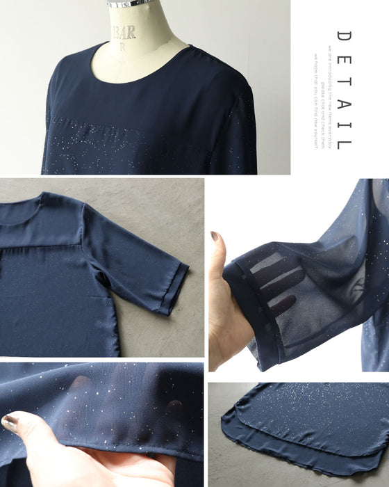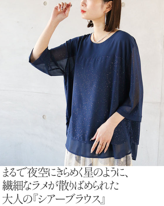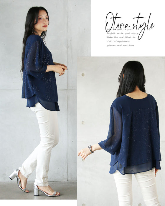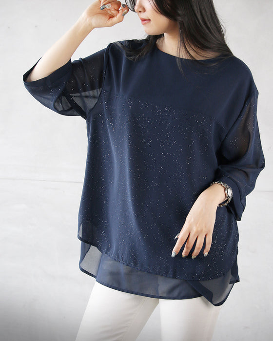 まるで夜空にきらめく星のように、繊細なラメが全体に散りばめられたブラウス。