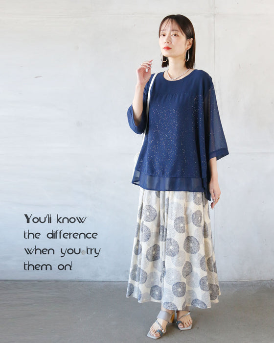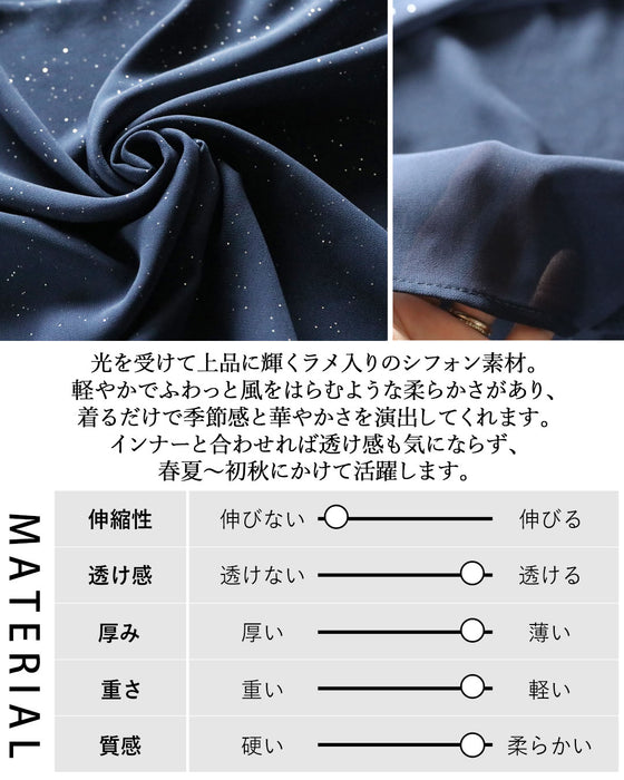 光を受けて上品に輝くラメ入りのシフォン素材。軽やかでふわっと風をはらむような柔らかさがあり、着るだけで季節感と華やかさを演出してくれます。裏地はないけれど、インナーと合わせれば透け感も気にならず、春夏〜初秋にかけて活躍。
