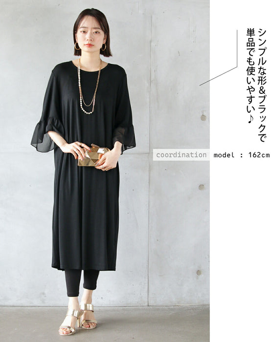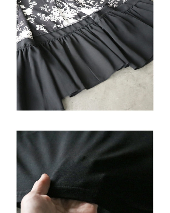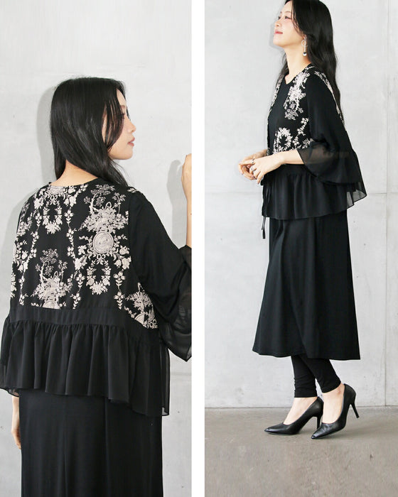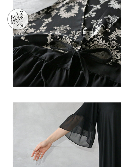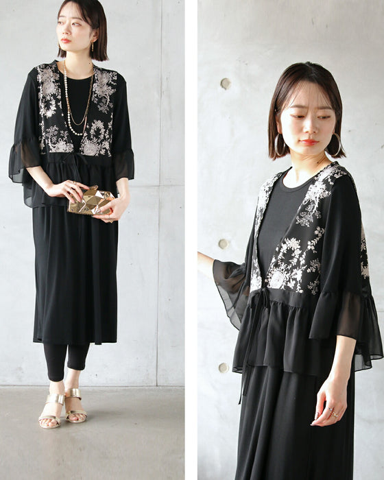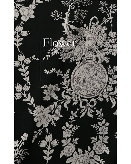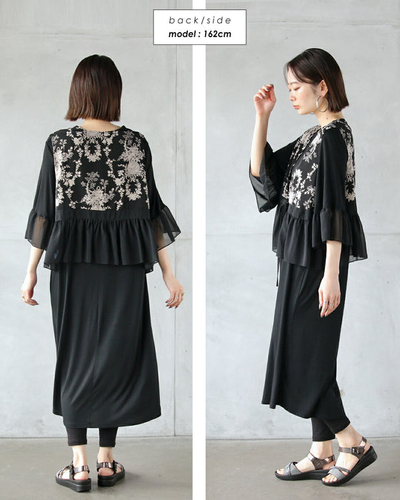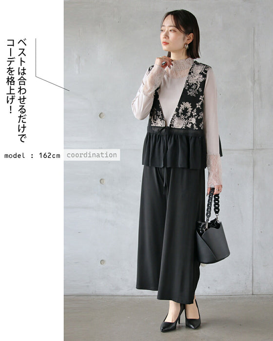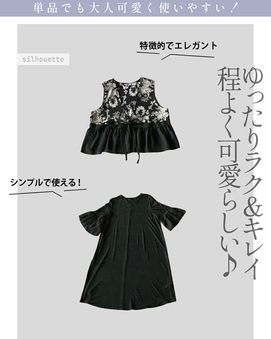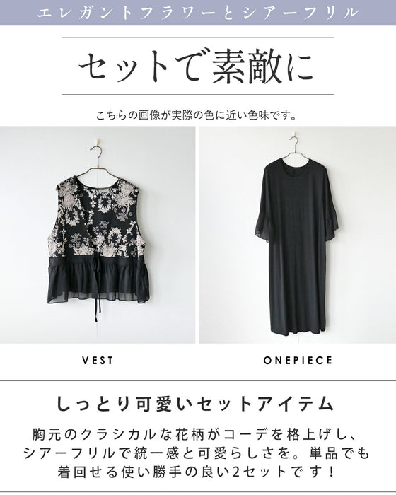 大人女性に向けたしっとり可愛いセットアイテムです。 胸元のシックでクラシカルな花柄がコーデを格上げし、シアーフリルで統一感と可愛らしさを。 単品でも着回せる使い勝手の良いブラックベース。きちんとしたシーンにも使え、セットでお得感♪