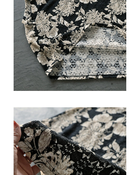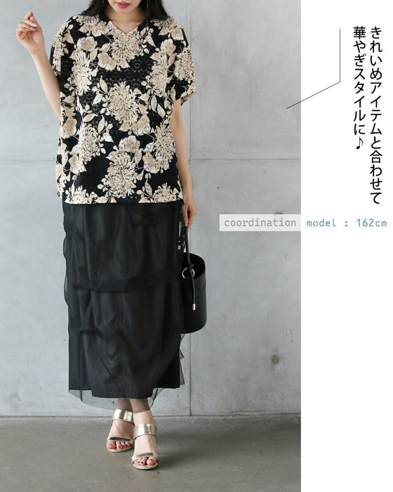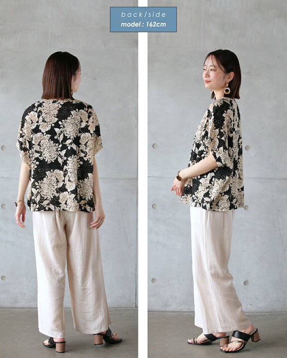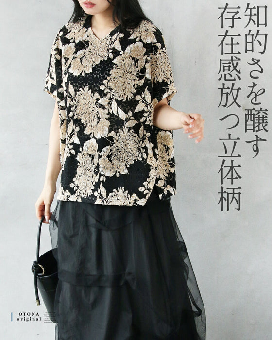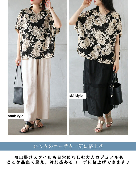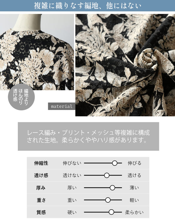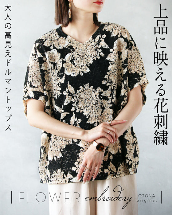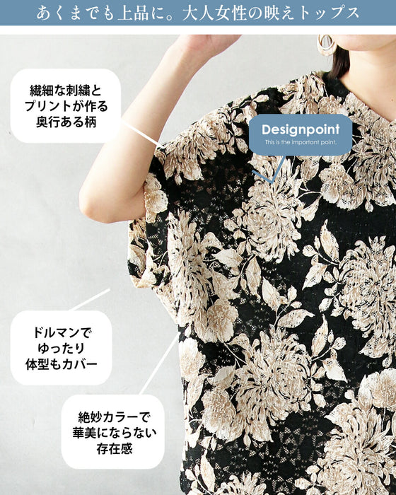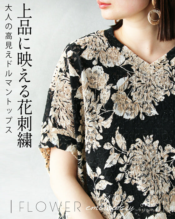 全面に咲き誇るフラワー刺繍のレースが目を惹く、高見えするドルマントップス。