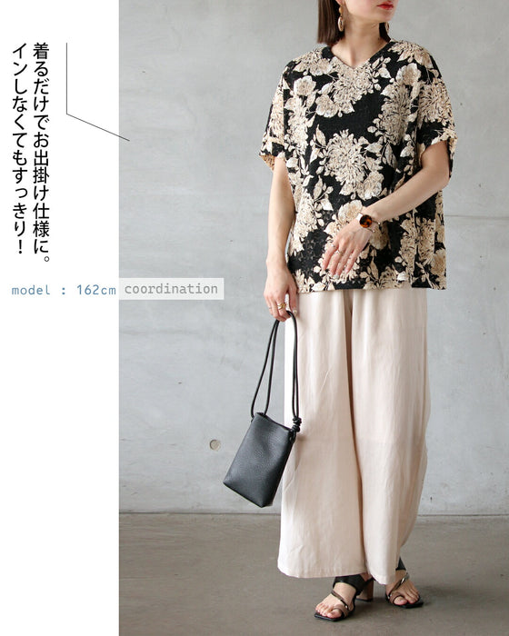 ほどよくゆとりのあるシルエットとVネックが顔まわりをすっきり見せ、こなれ感をプラスします。