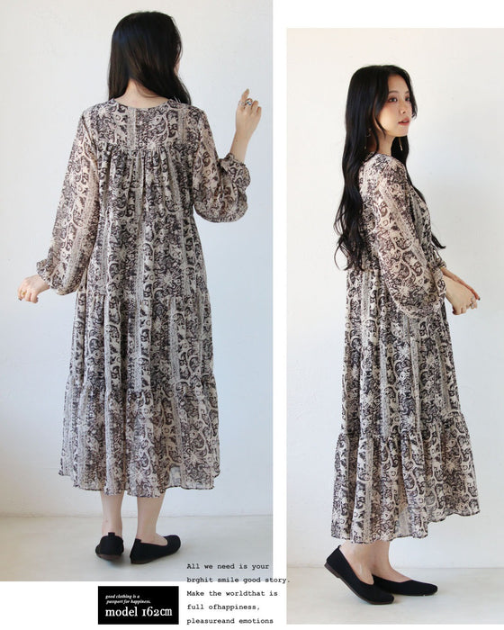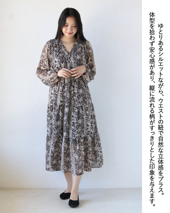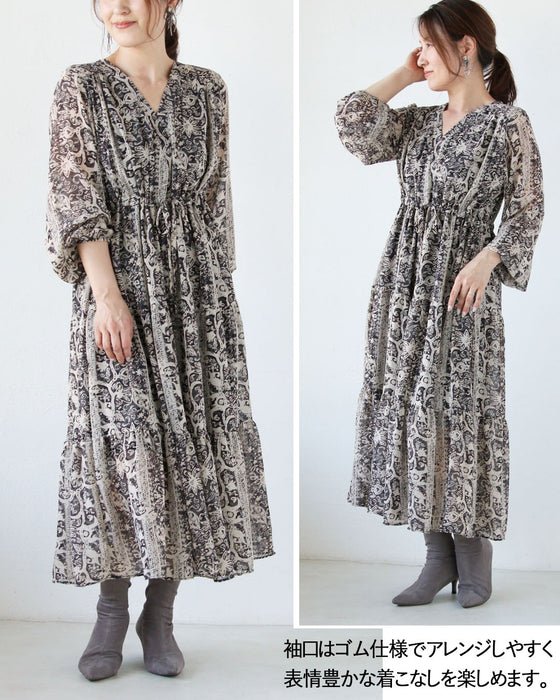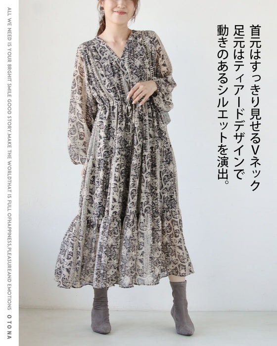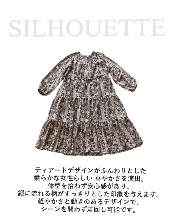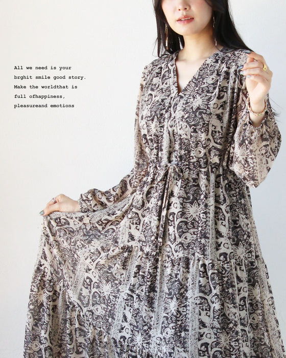 日常を格上げする華やぎワンピース。首元をすっきり見せるVネックに、ティアードデザインで動きのあるシルエットを演出。華やぎと抜け感をひとさじ。大人に似合う、落ち着いたエスニック柄デザイン。