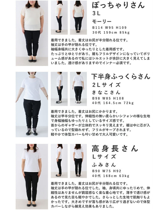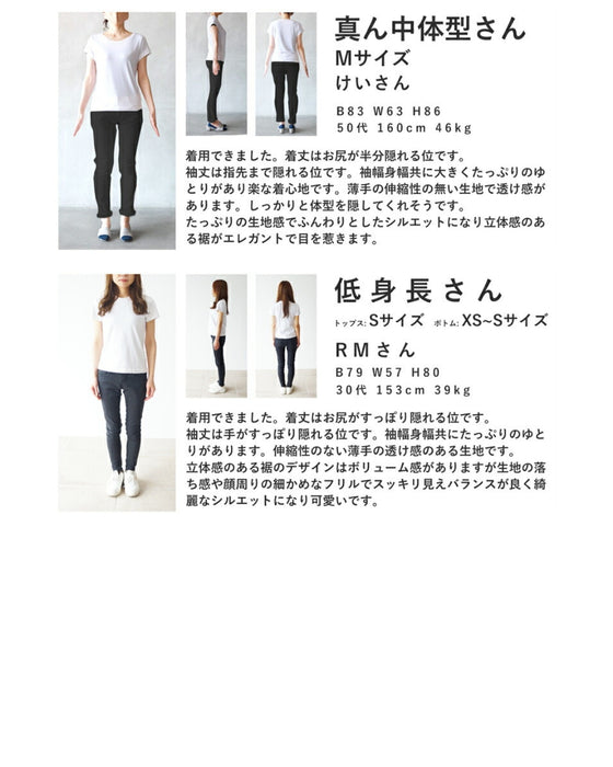 たっぷりとしたゆとりのあるサイズ感で幅広い体型の方まで対応。気になる体のラインを拾わず体型カバーが叶います。