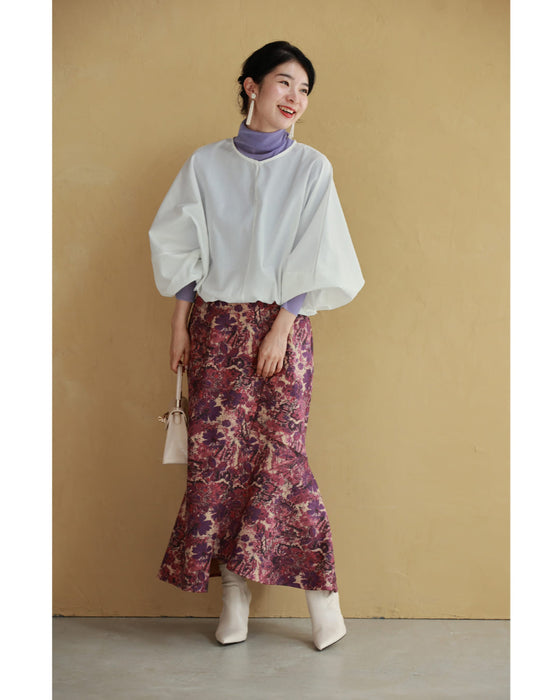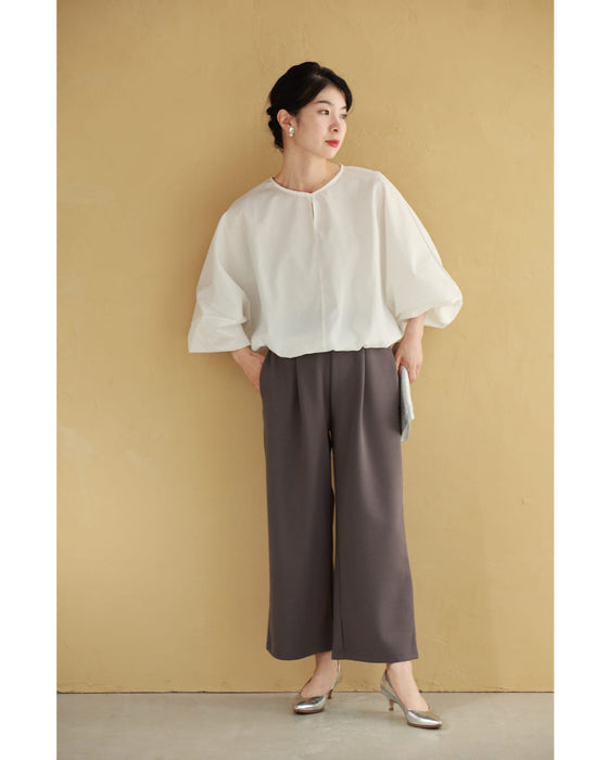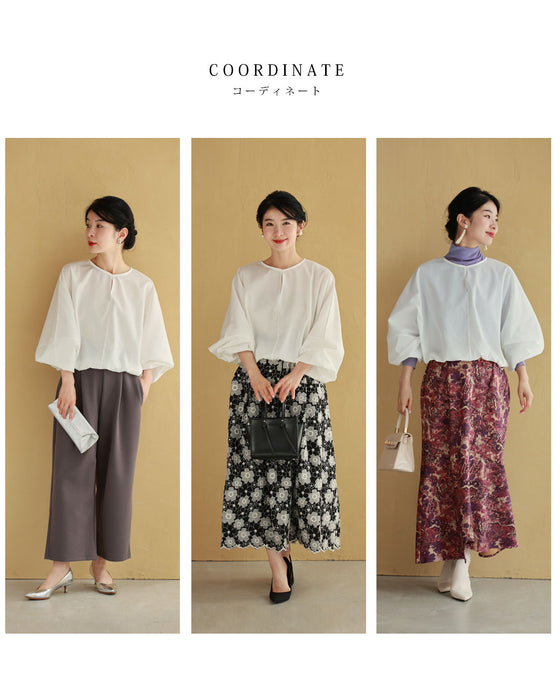 自然とウエストや腰回りはすっきりし、裾部分がふんわりと広がるバルーンシルエットを作ります。これにより、全体的にメリハリのあるスタイルが演出され、スタイルアップ効果も期待できます。