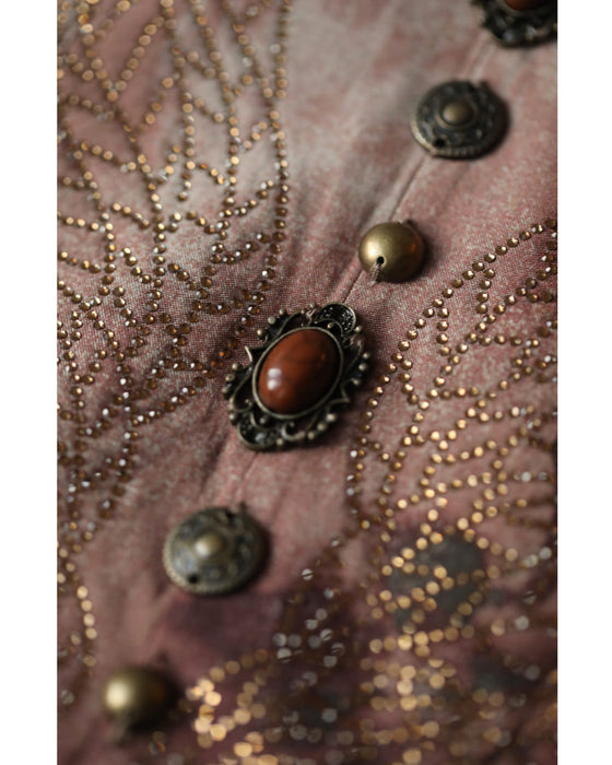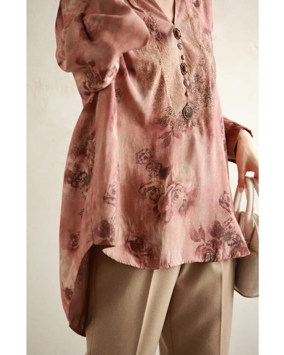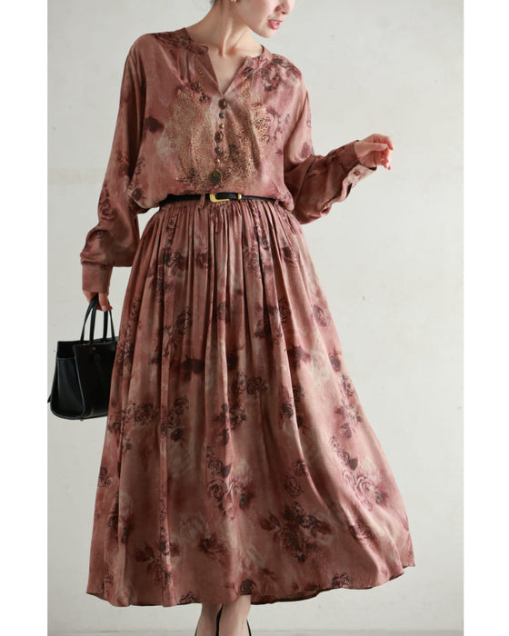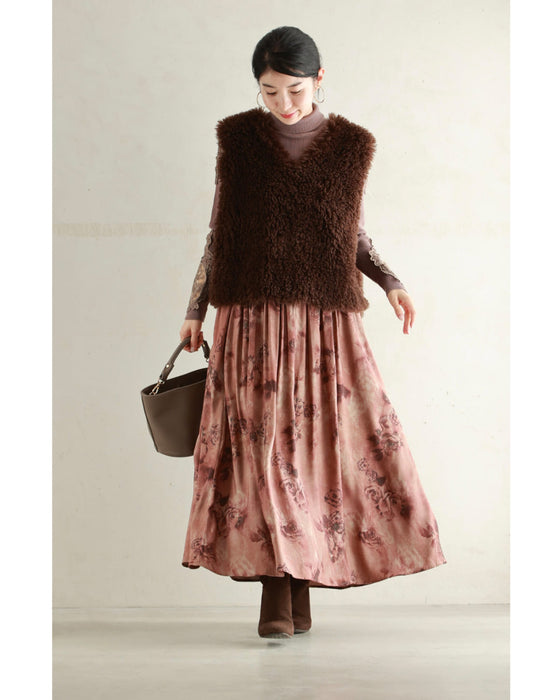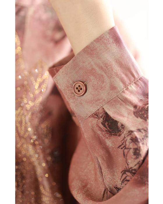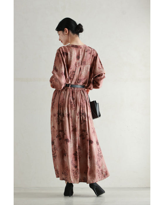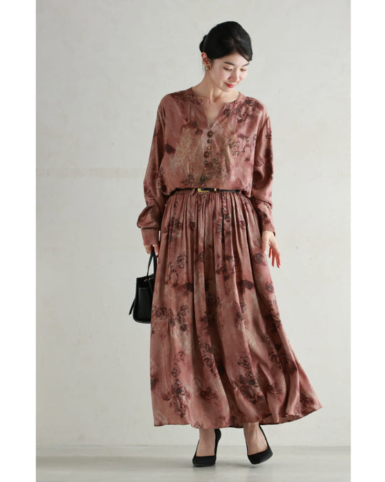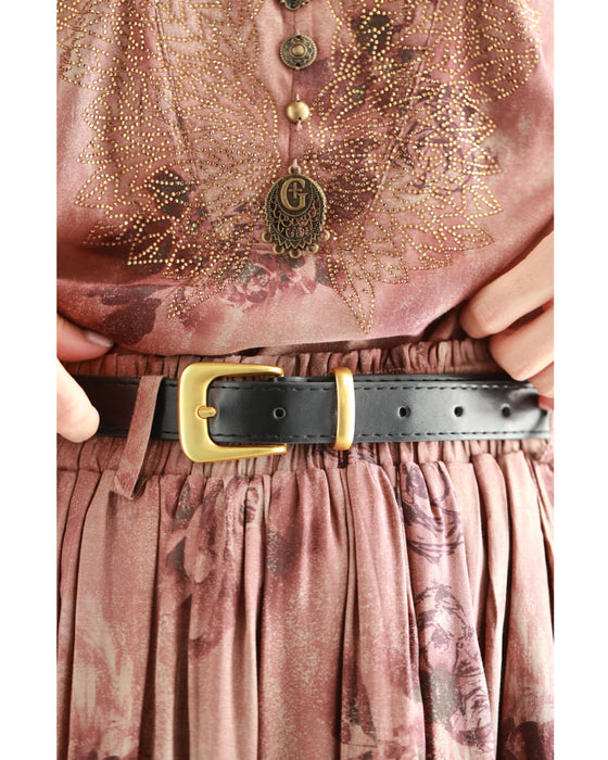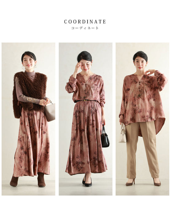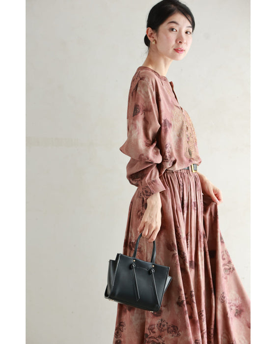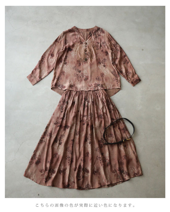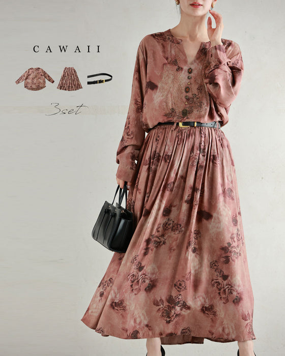浮かび上がるバラ画のブラウスとスカート、さらにベルトがセットになった3点セットはスタイリングの幅を広げてくれるアイテムです。美しいバラの絵柄が優雅に浮かび上がり、華やかさを演出します。