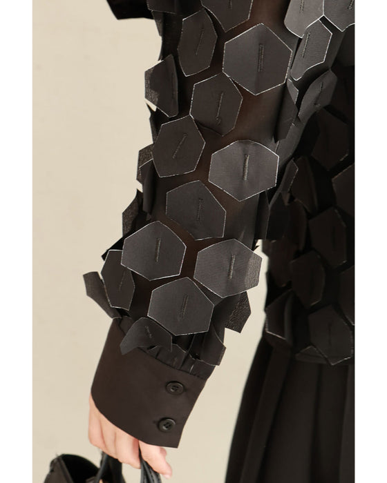 さりげなく煌めく立体モチーフが施されており、光の角度によって変化するその輝きは、見る人を惹きつけます。着るだけで自信を与えてくれる、そんな特別な一着です。