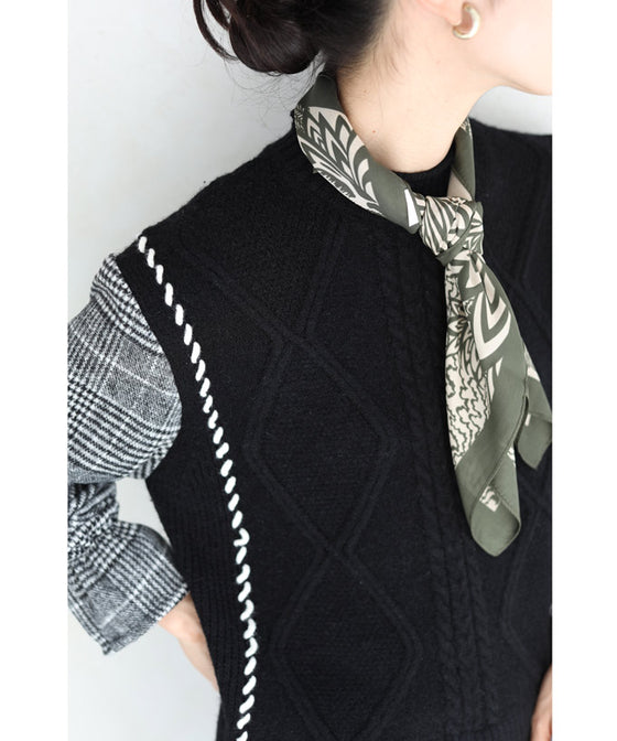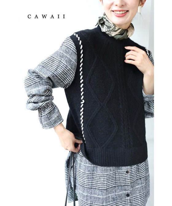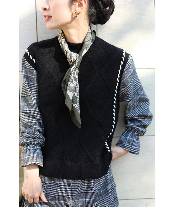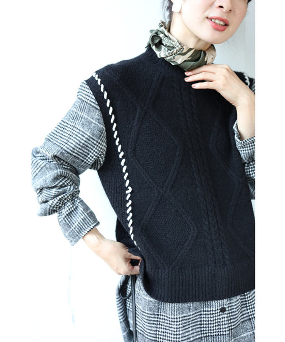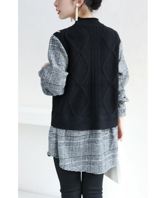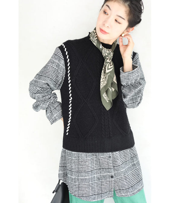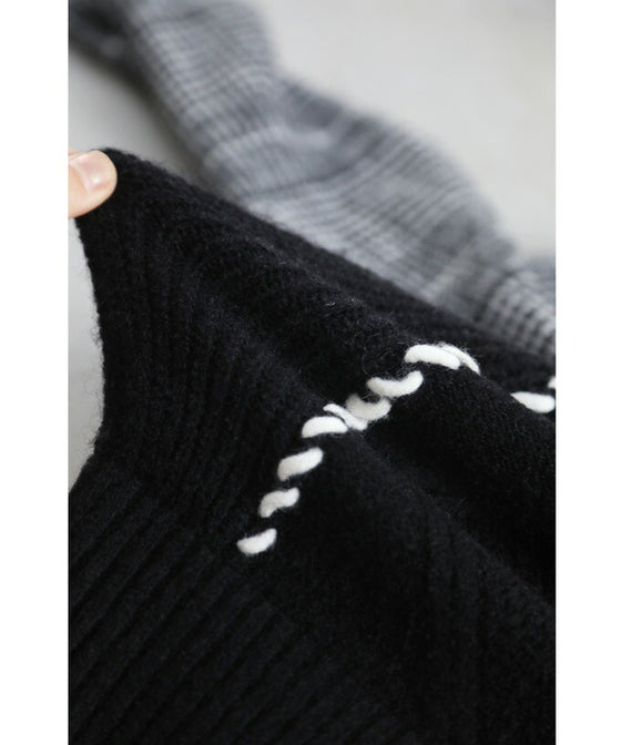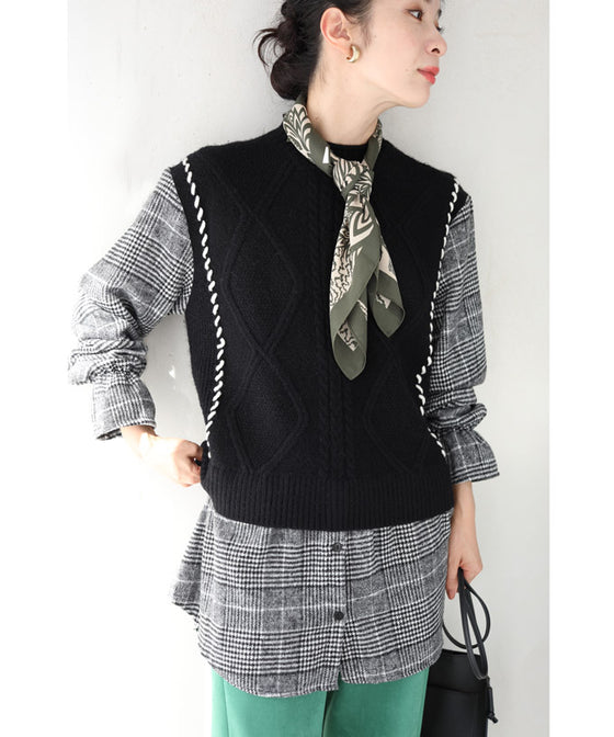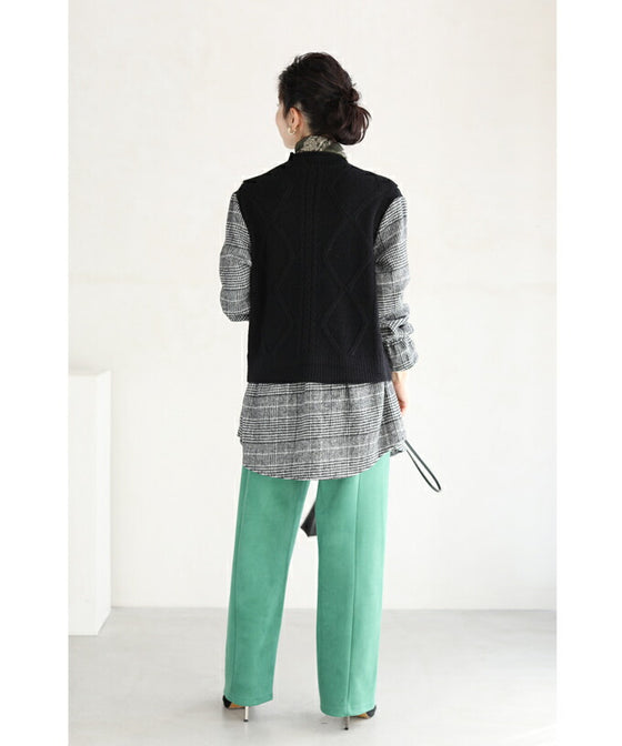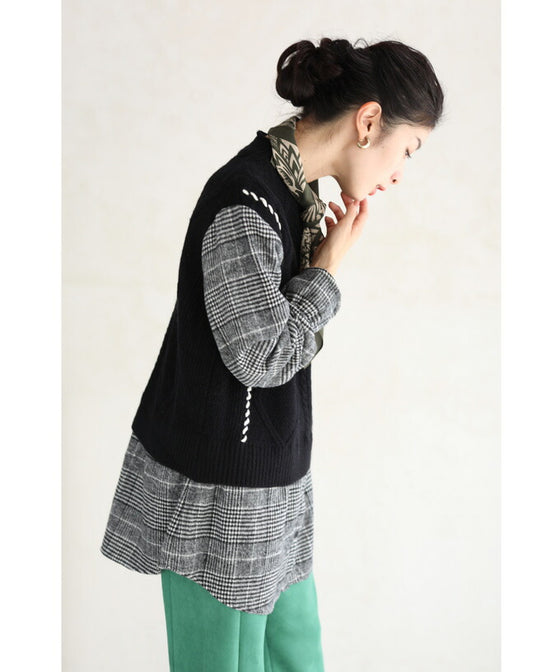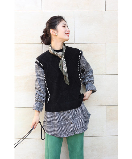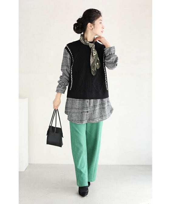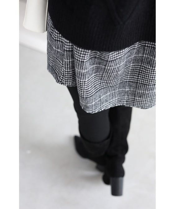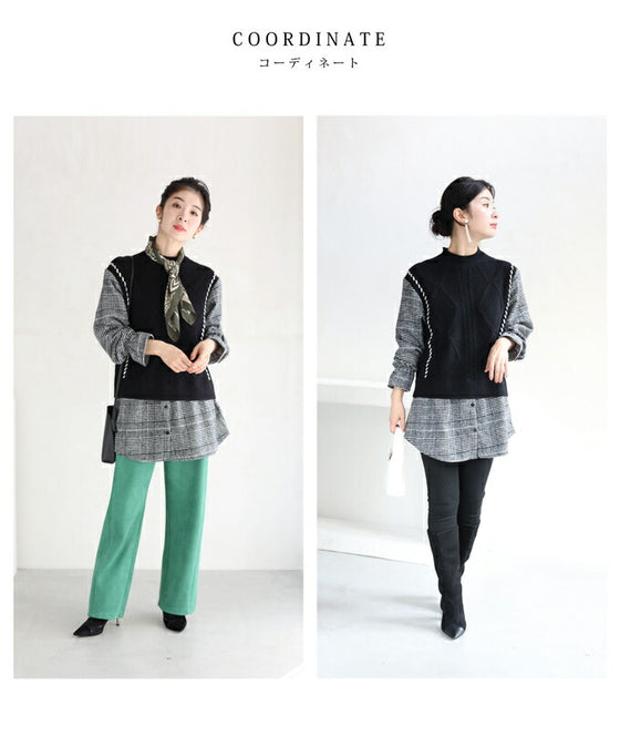 上品な風合いのチェック柄がカジュアルにも綺麗めにもしっかり対応♪重ね着風ニットのサイドのホワイトカラーのステッチがアクセントになりスタイルアップ効果を発揮、全体をスッキリとした印象にしてくれます◎