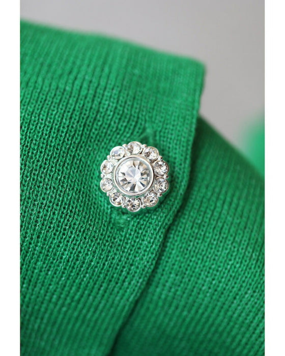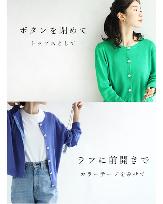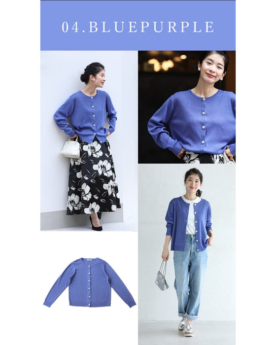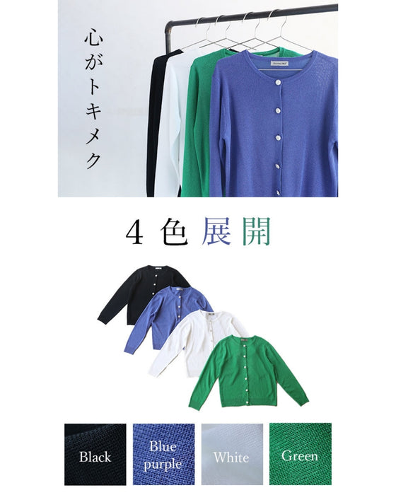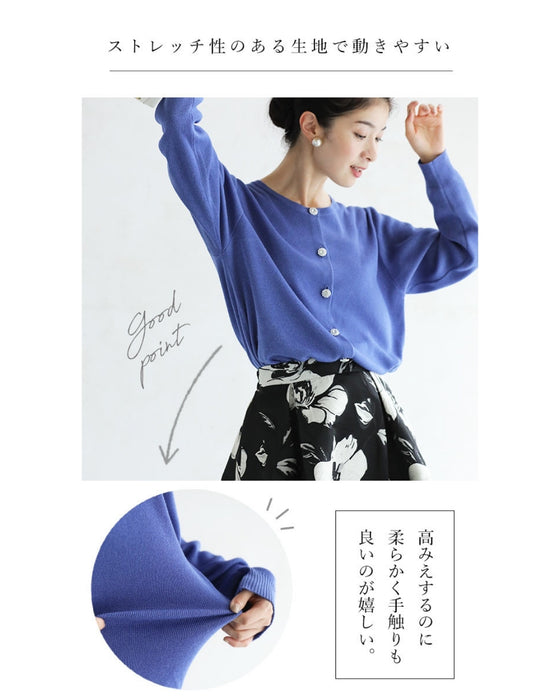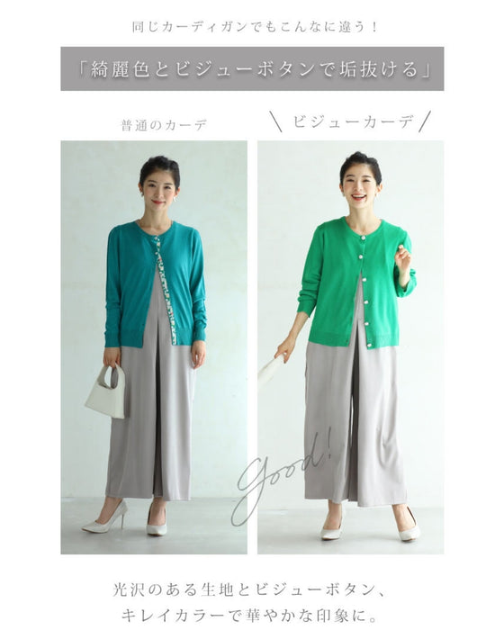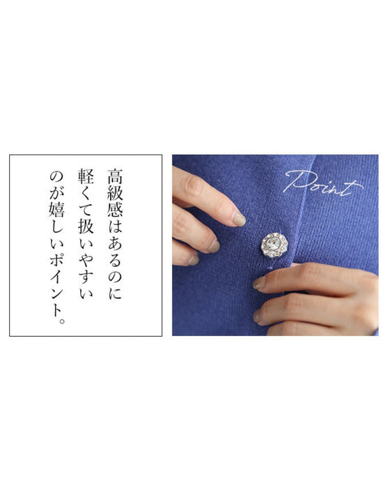 シンプルで美しいカーディガンに輝くビジューボタンが綺麗。高級感はあるのに軽くて扱いやすいのが嬉しいポイント。