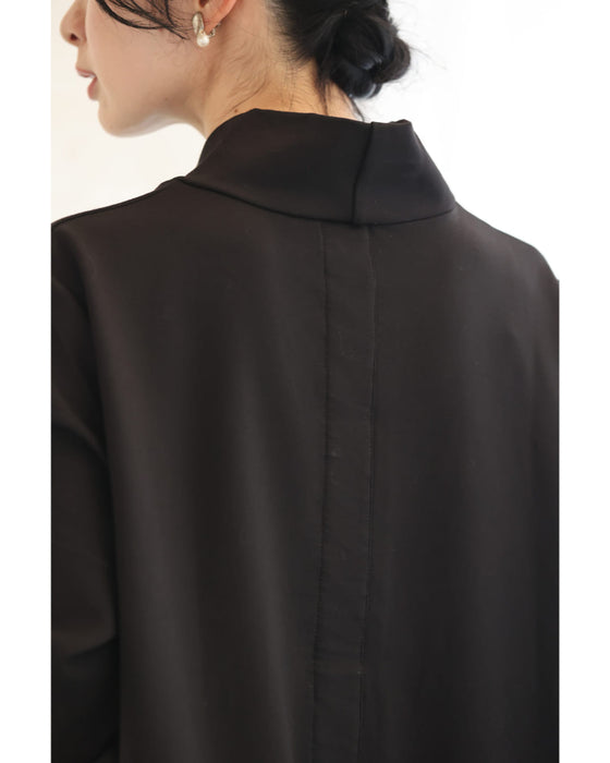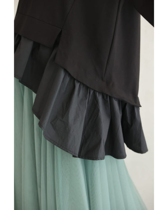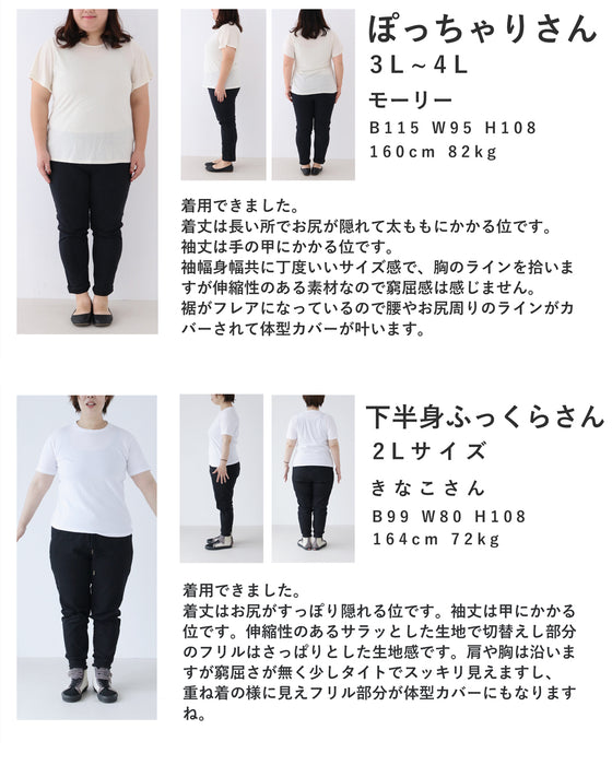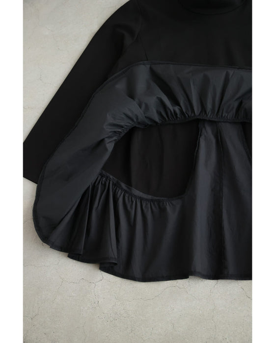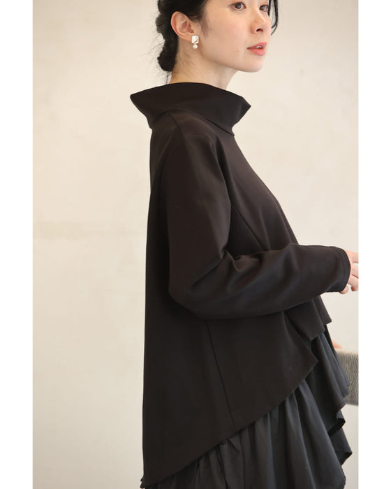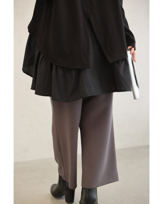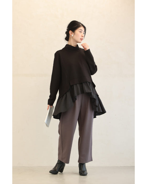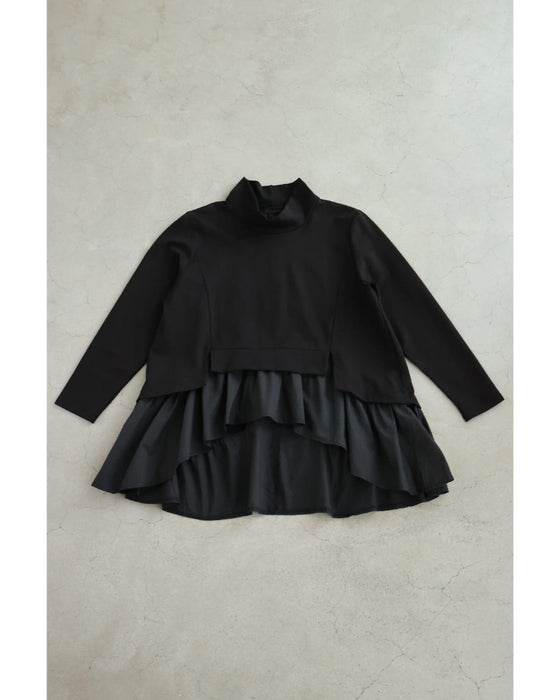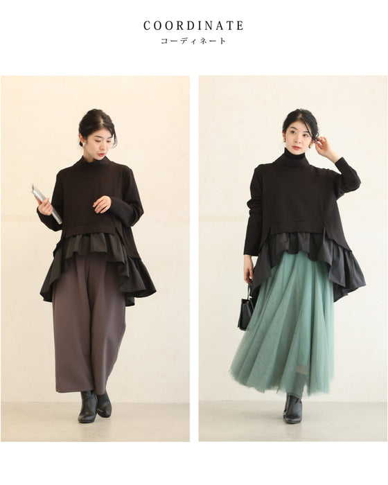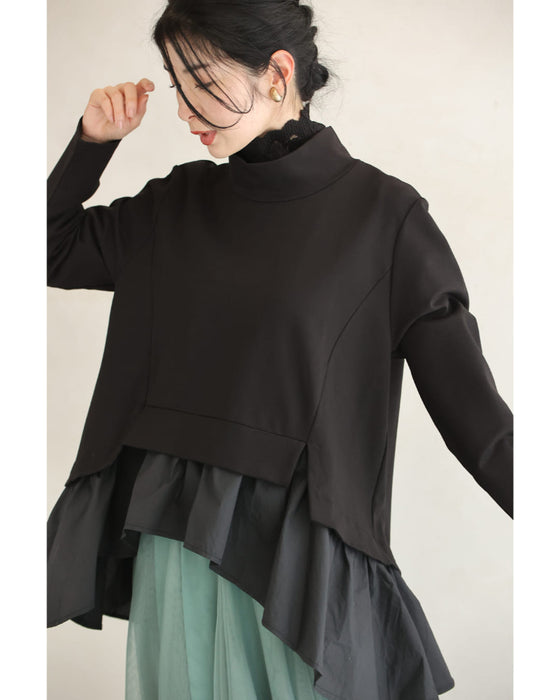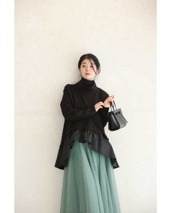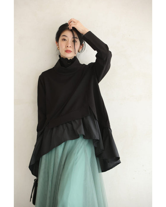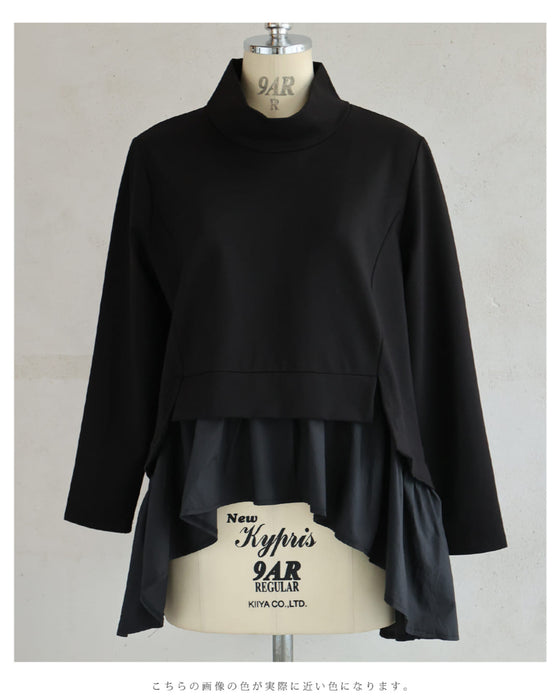 広がるフィッシュテール裾の重ね着風プルオーバートップス