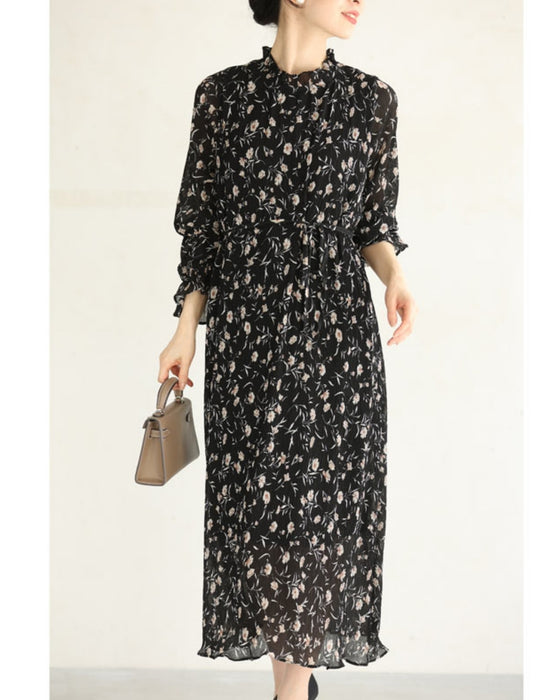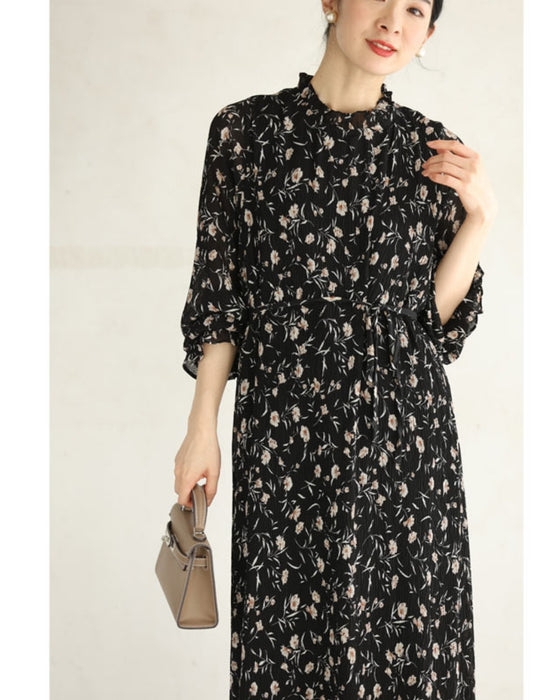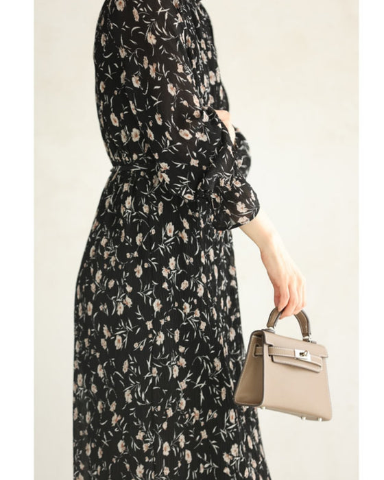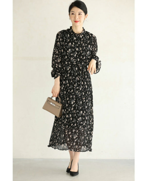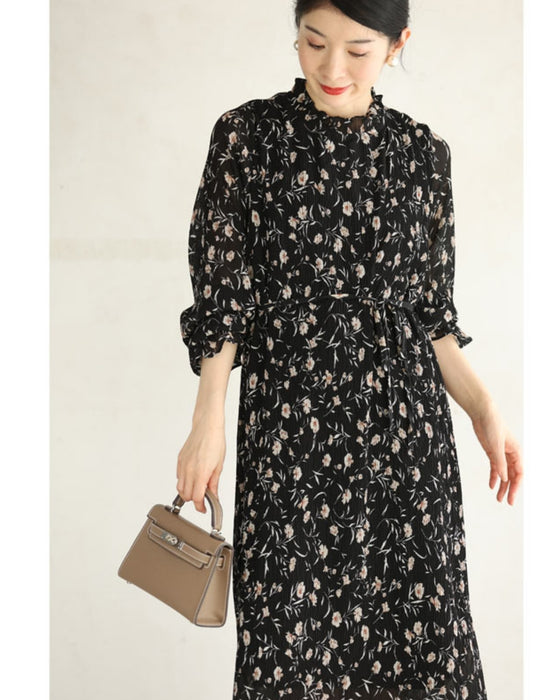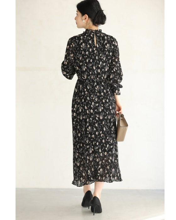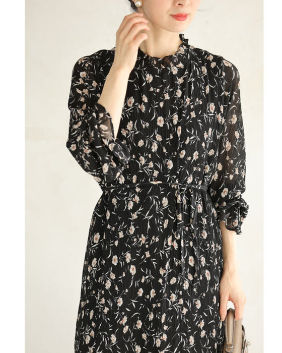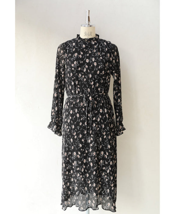 (紐ベルト付き)細やかプリーツの小花柄ミディアムワンピース