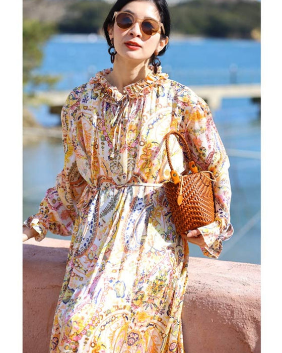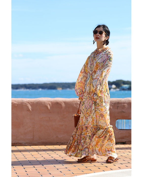 (紐ベルト付き)カラフルな色遊びペイズリーのフリルネックロングワンピース