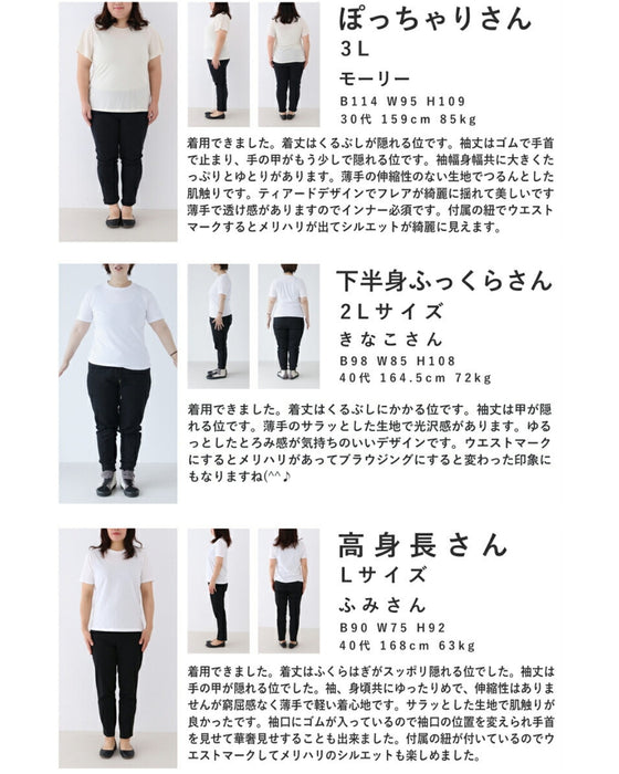 ゆったりとしたサイズ感でスルッと着れる。身幅袖幅にゆとりがあってラインを逃がす。ギャザーが入りより足元がふんわりとして足さばきもラクチンで歩きやすい。