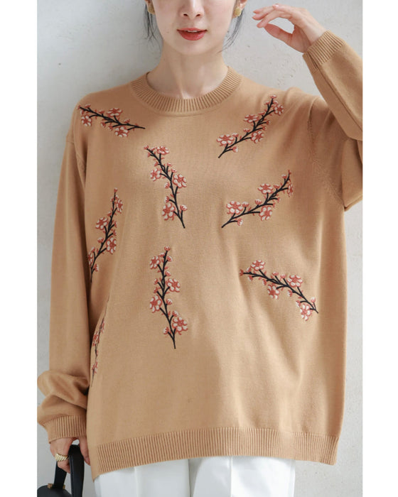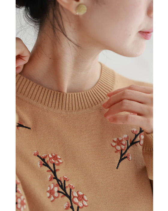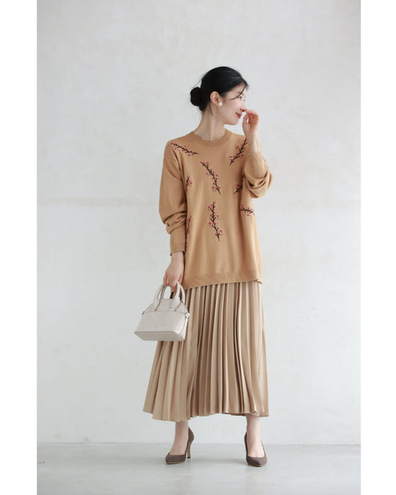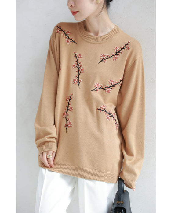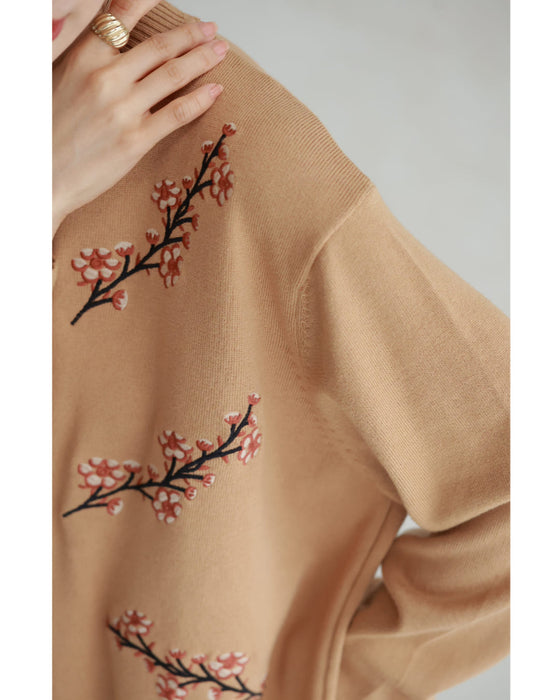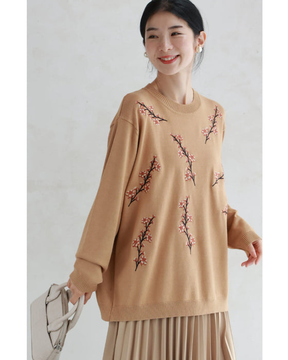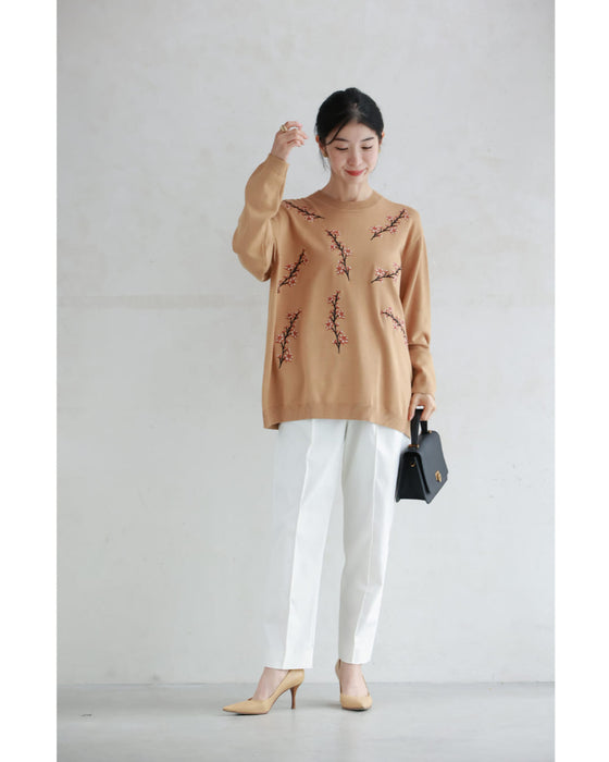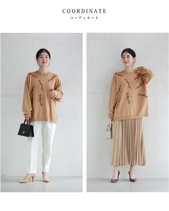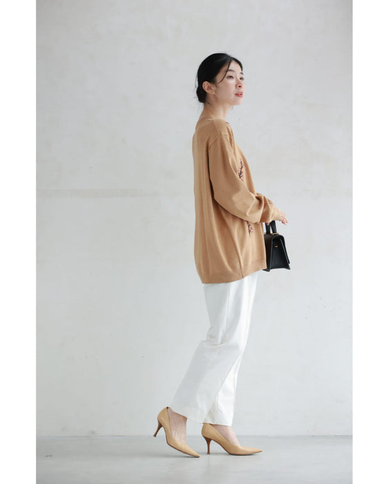 柔らかい秋カラーで描かれたお花の刺繍が、まるで舞い踊るような印象を与え、シンプルなコーディネートに華やかさをプラスします。このデザインは、女性らしさを引き立てつつ、どこか温かみを感じさせるため、秋のおしゃれにぴったりです。