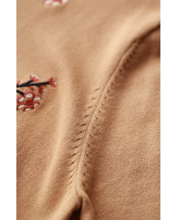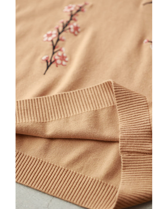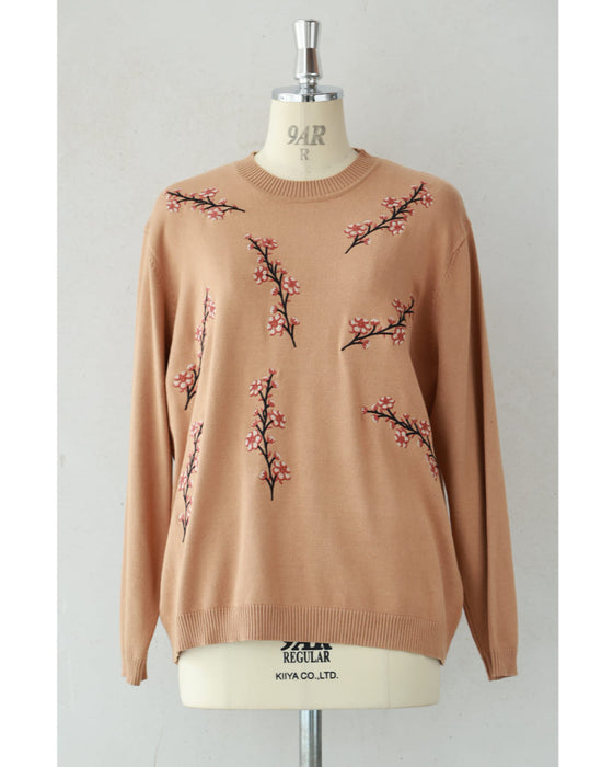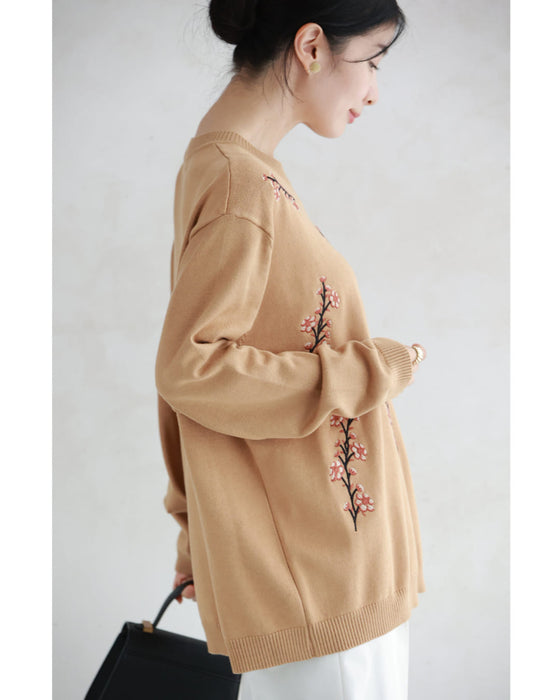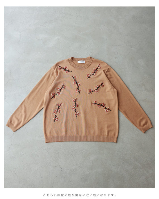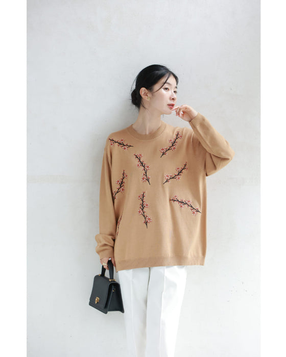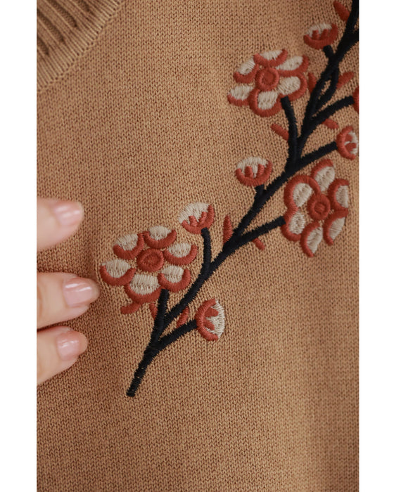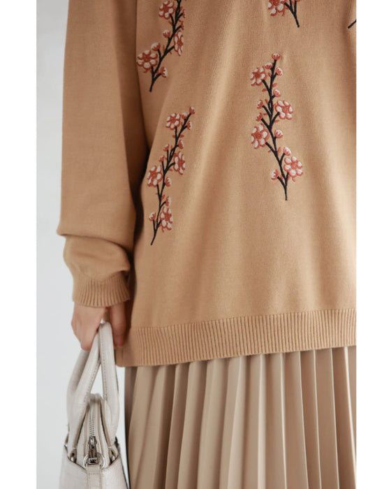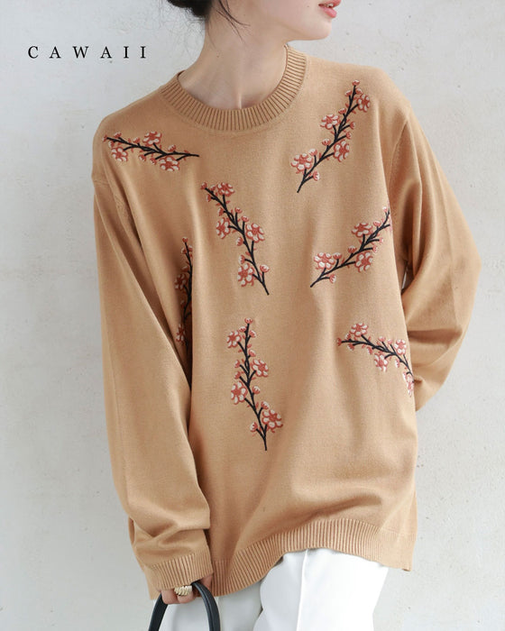 柔らかい秋カラーで描かれたお花の刺繍が、まるで舞い踊るような印象を与え、シンプルなコーディネートに華やかさをプラスします。このデザインは、女性らしさを引き立てつつ、どこか温かみを感じさせるため、秋のおしゃれにぴったりです。