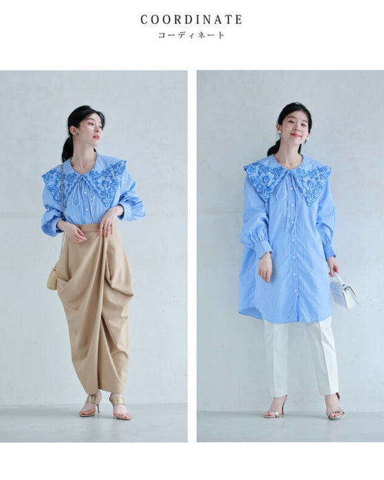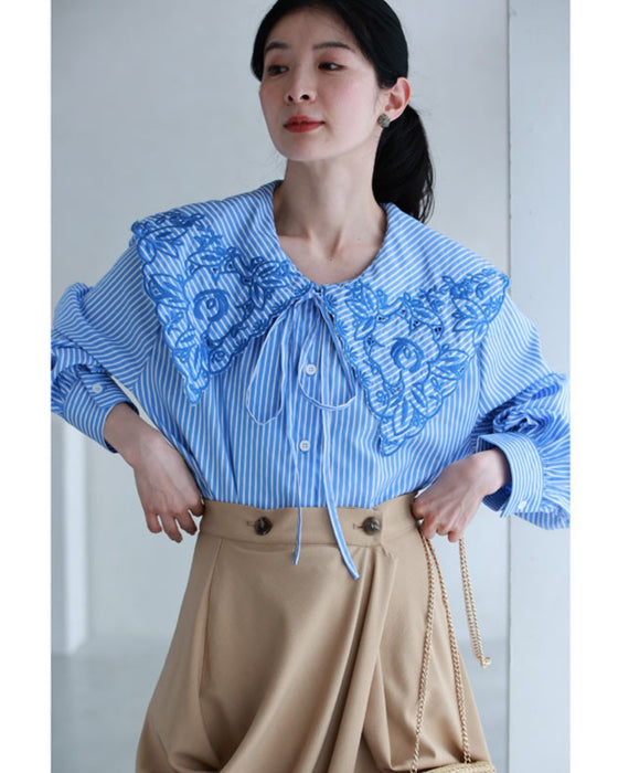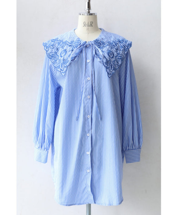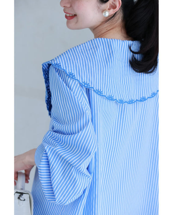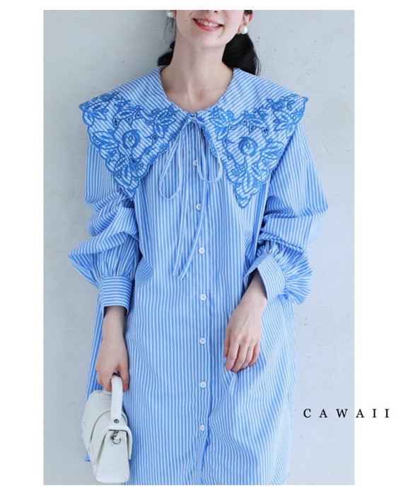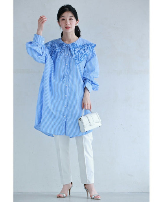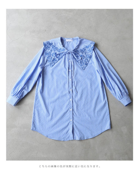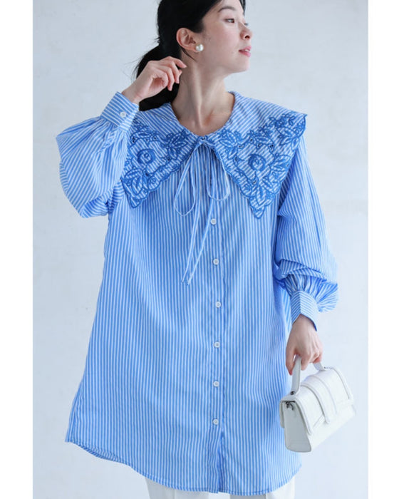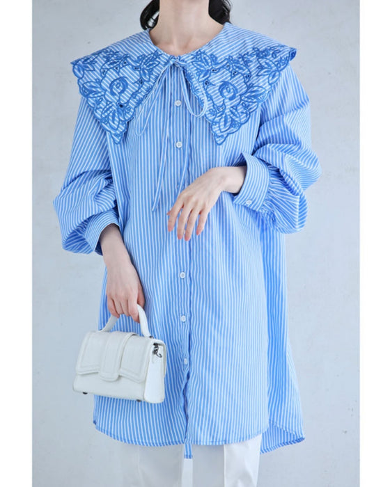 刺繍が美しいビッグカラーのストライプロングシャツトップス