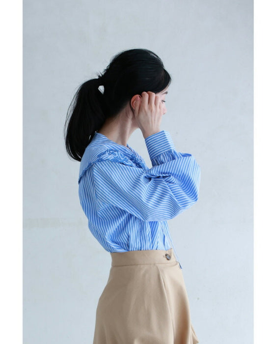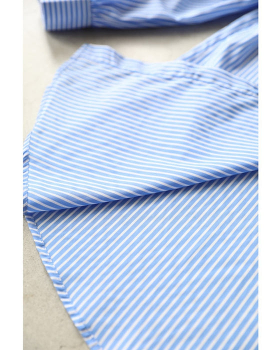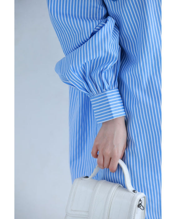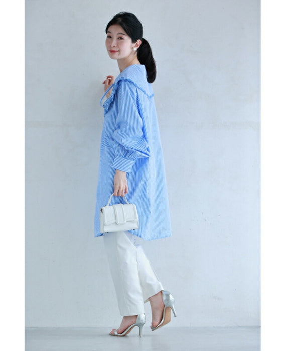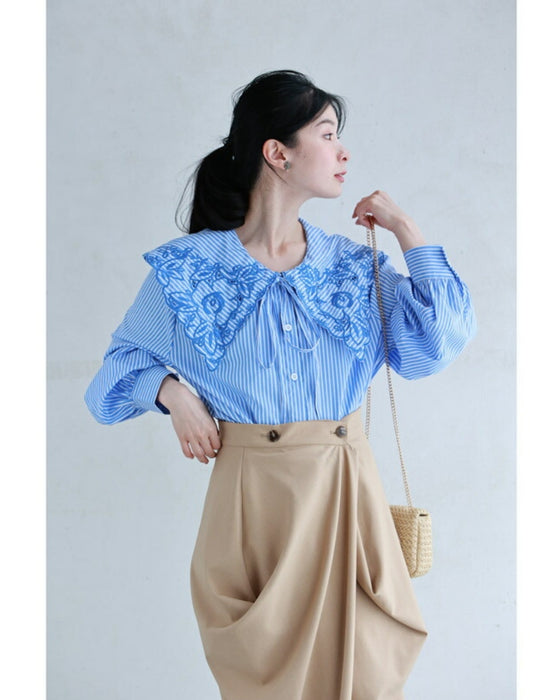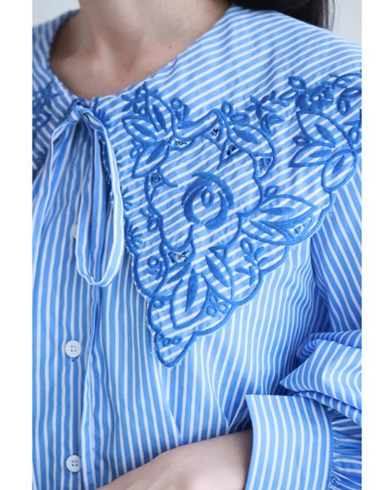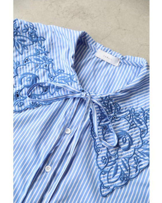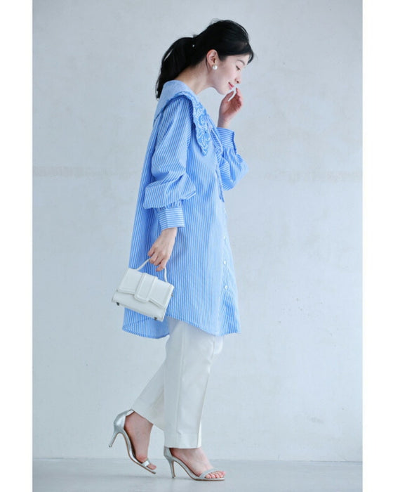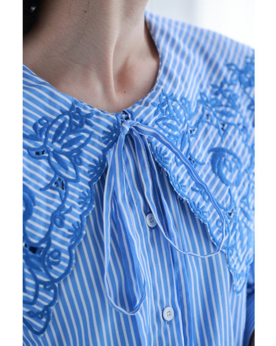 刺繍が美しいビッグカラーのストライプロングシャツトップス