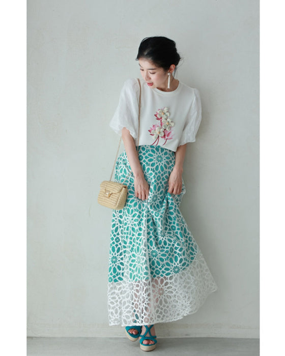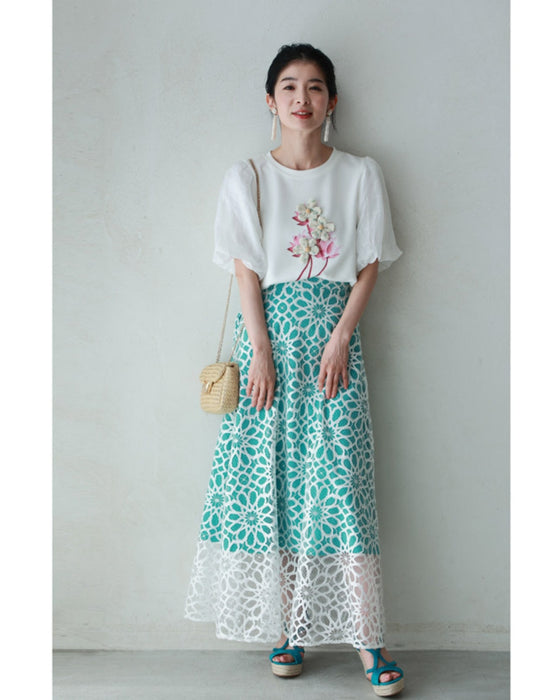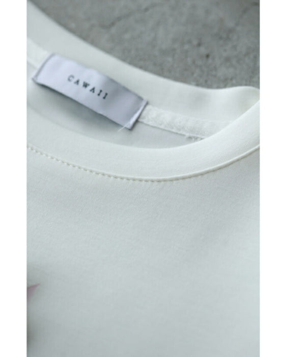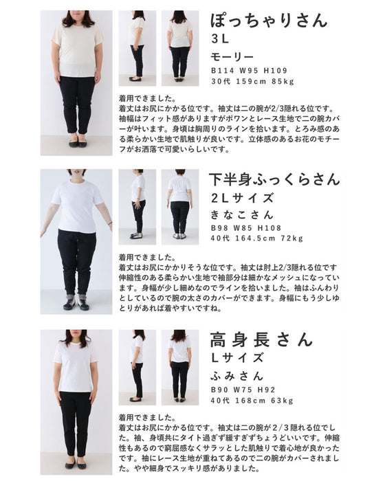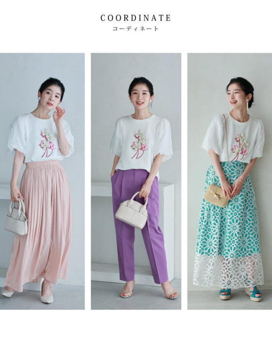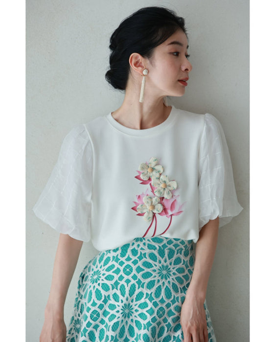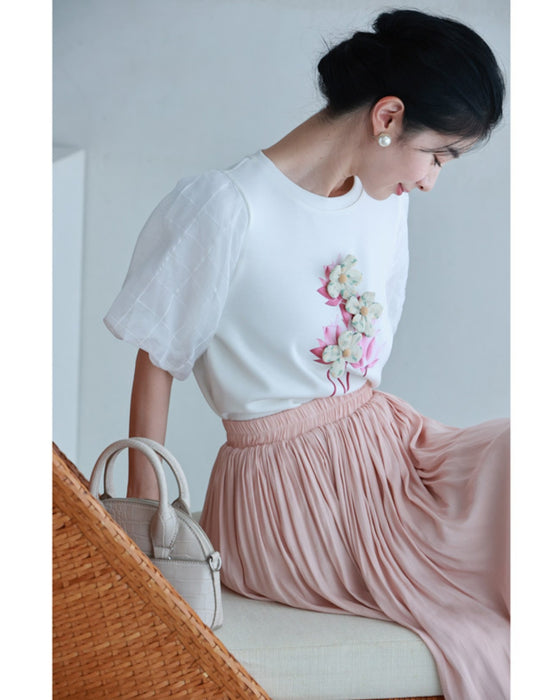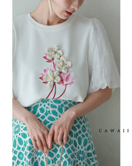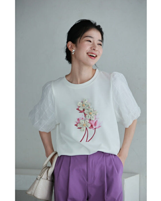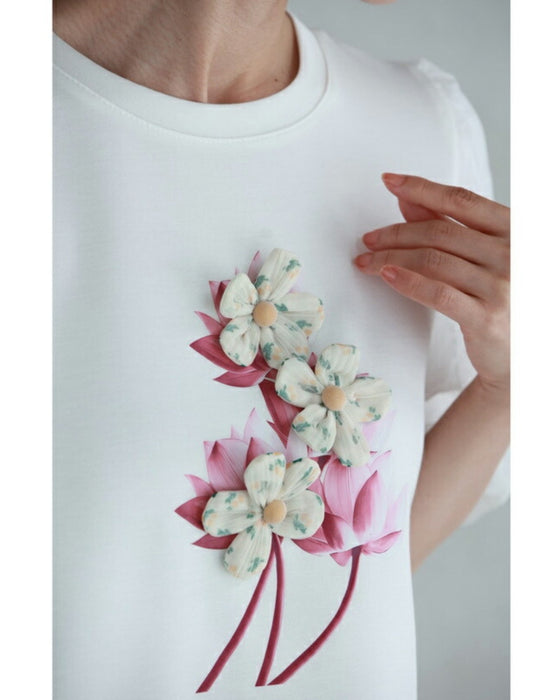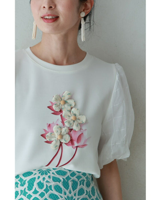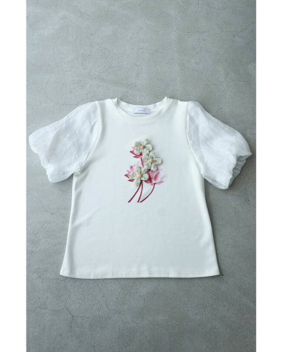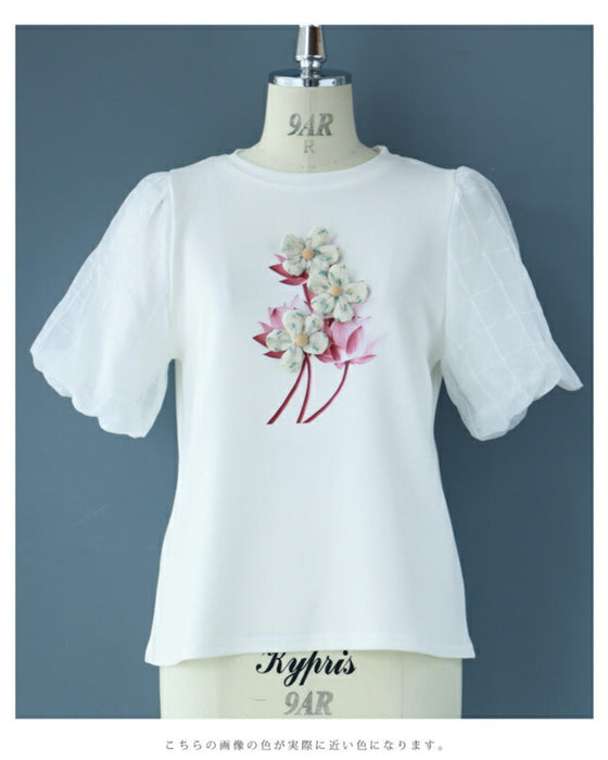 浮き立つ立体花が可愛らしいデザインが特徴のTシャツです。華やかな花々が生地から立体的に浮かび上がり、着るだけで女性らしさを引き立てます。