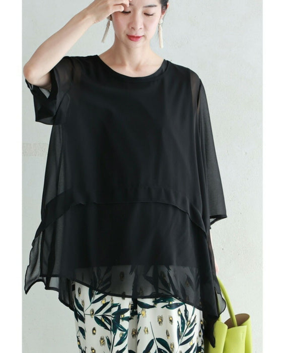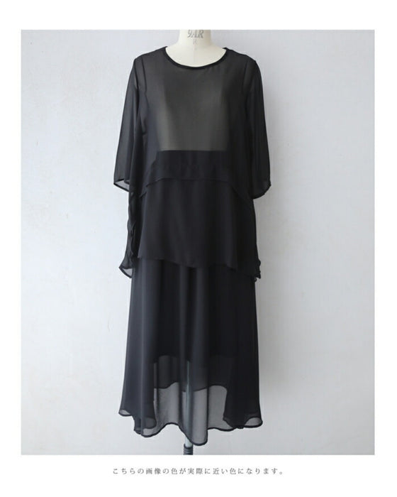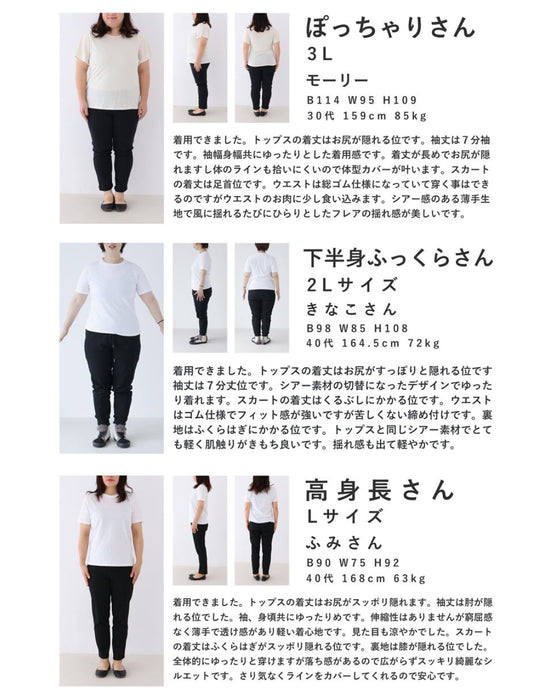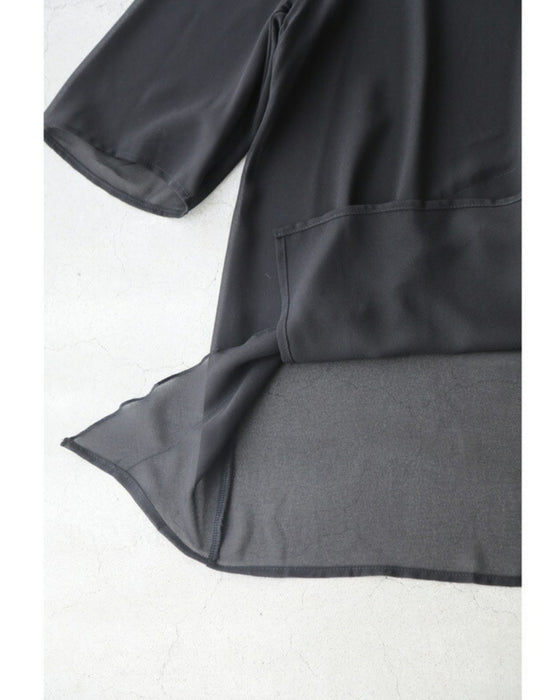 透け感のあるシアー素材は、軽やかさと涼しさを感じさせ、季節を問わず着用できる優れたデザインです。シアーの特性を活かしつつも、程よい透け感に仕上げているため、身体のラインをさりげなくカバーしながら、洗練された印象を与えます。