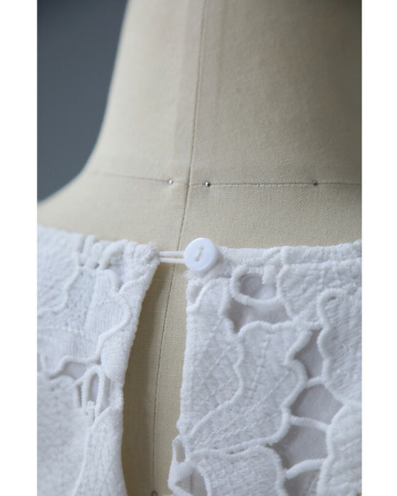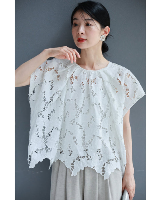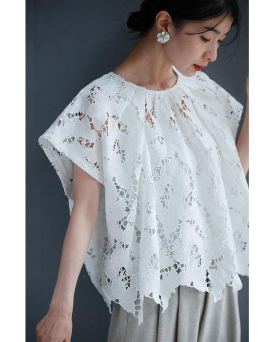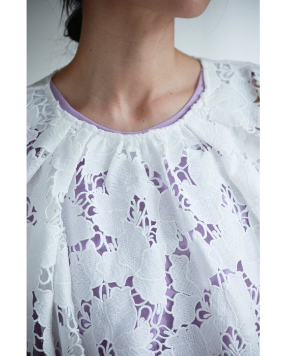 見た目にも涼やかなレースが印象的で首周りにギャザーが入って着るだけで様になる。
