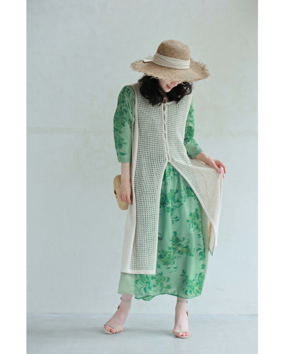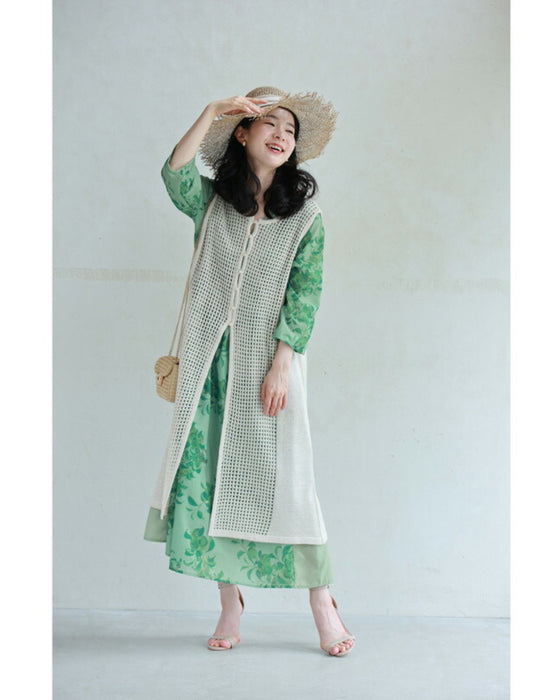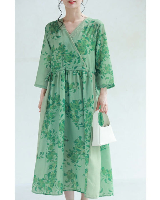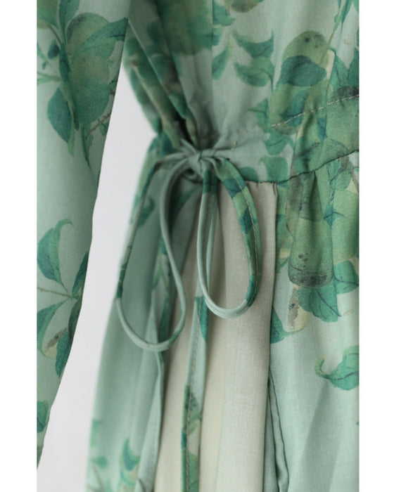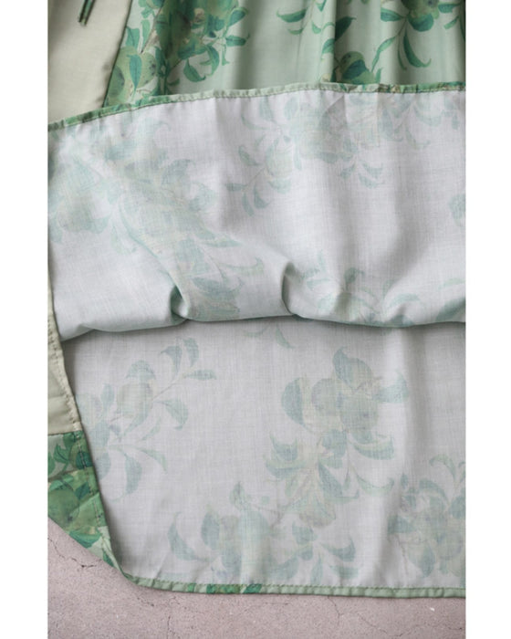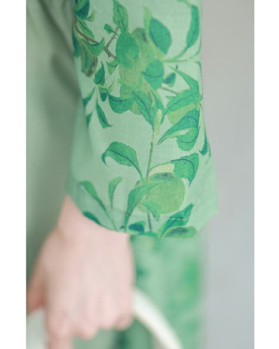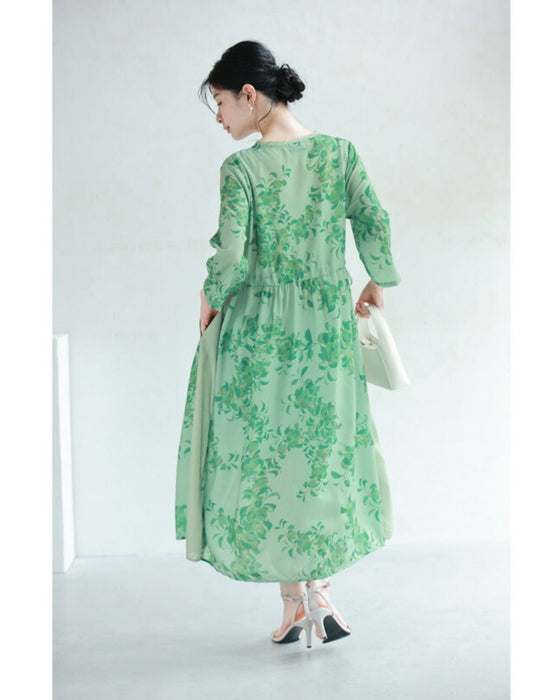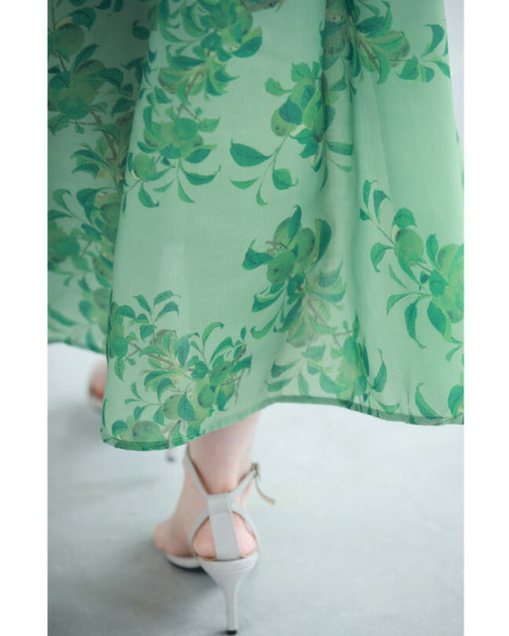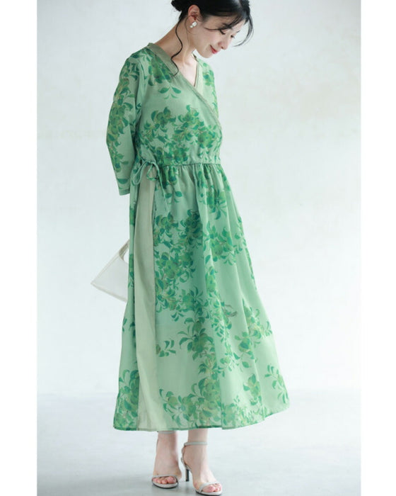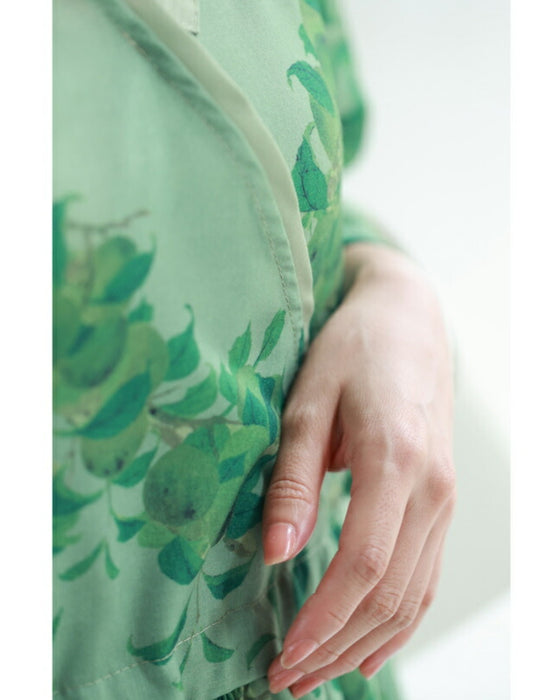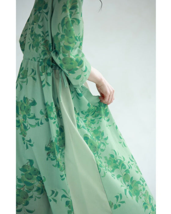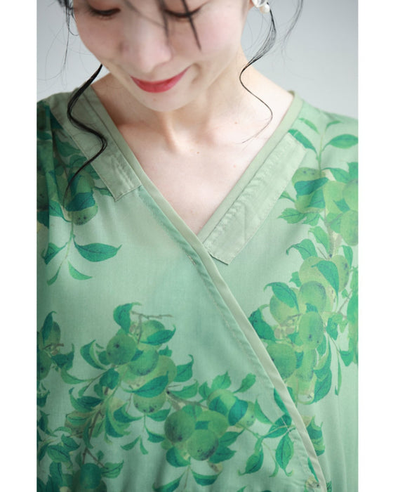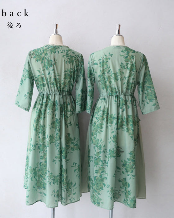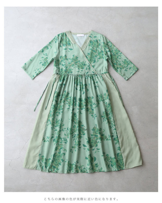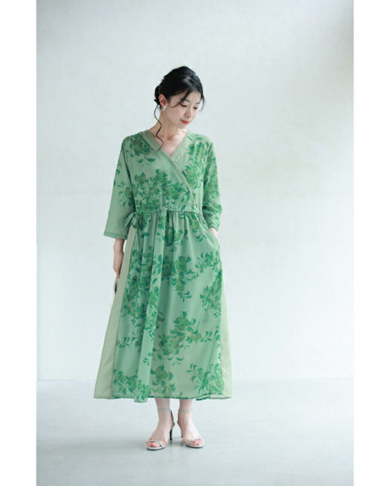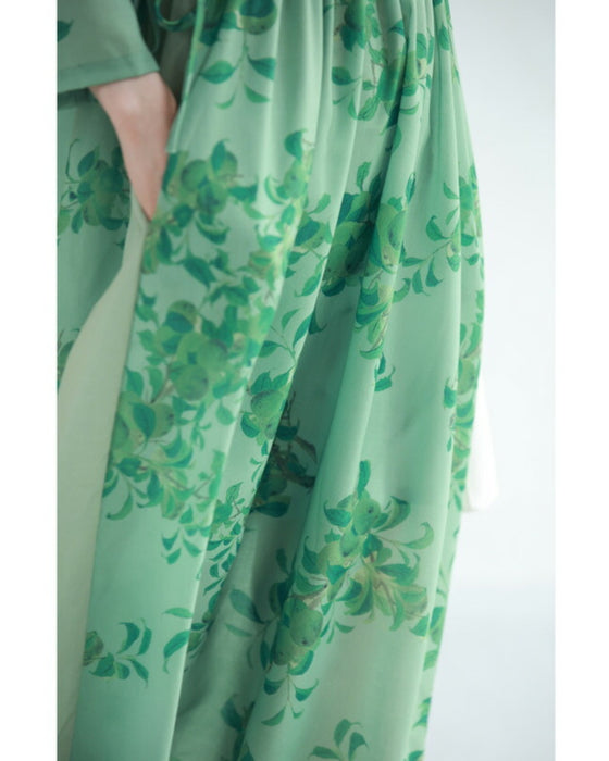 青梅のデザインは初夏の風を感じさせてくれるワンピースで、爽やかな印象があります。花柄など可愛すぎるデザインが苦手な方にも着ていただきたい♬サイドのスカート部分は無地デザインになっていて横から見たときにスッキリ感があり着やせ効果にも期待できる一枚です。