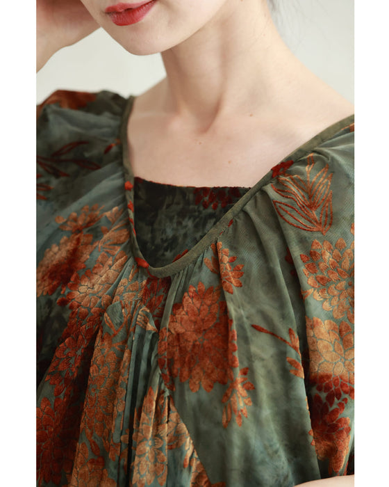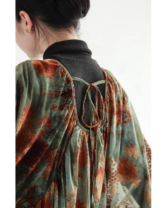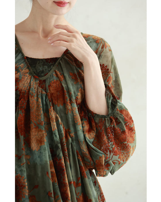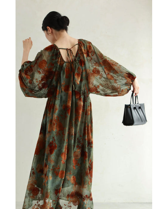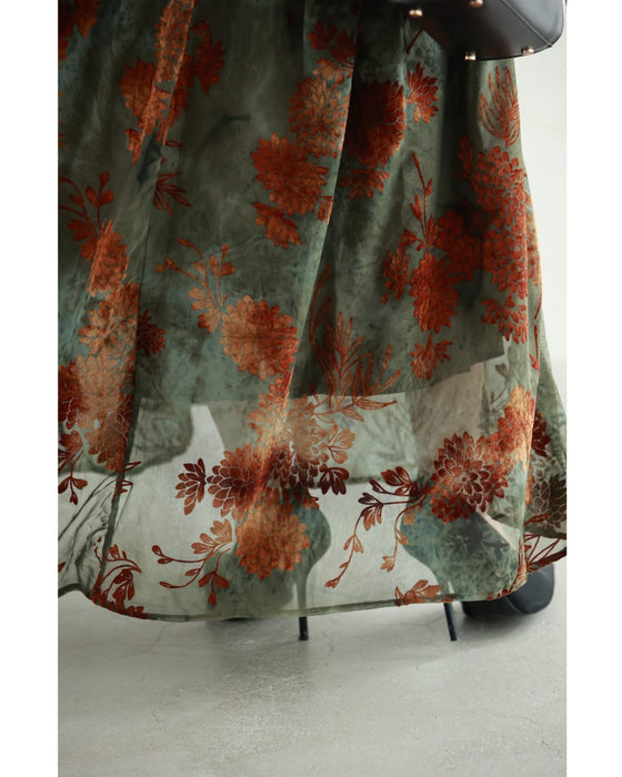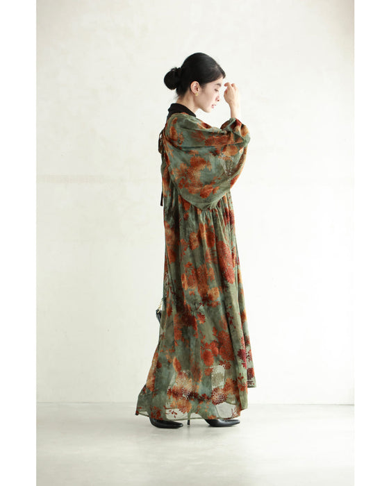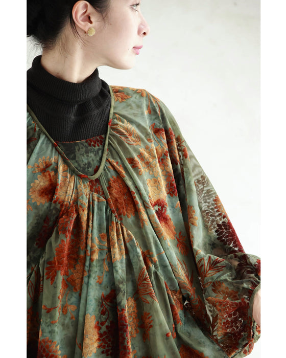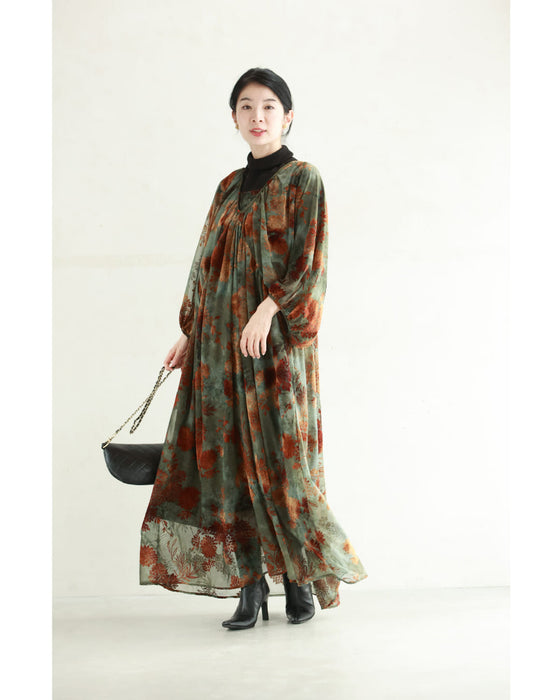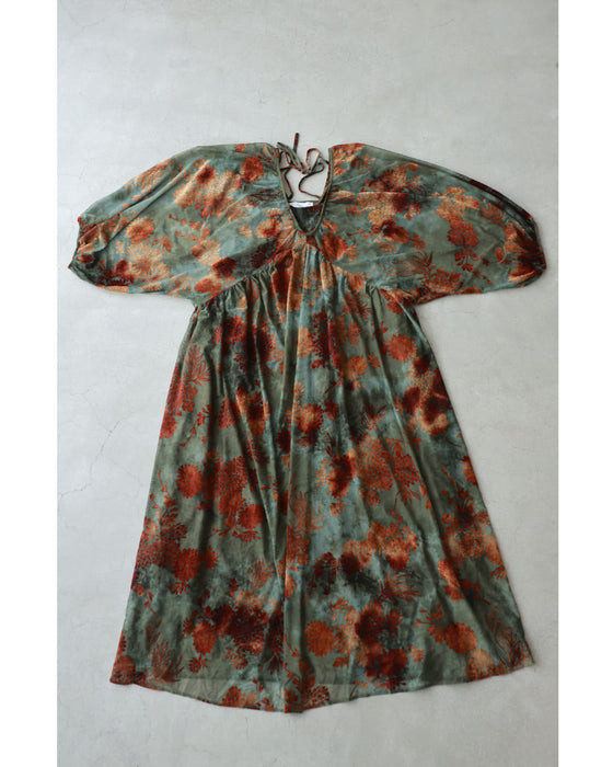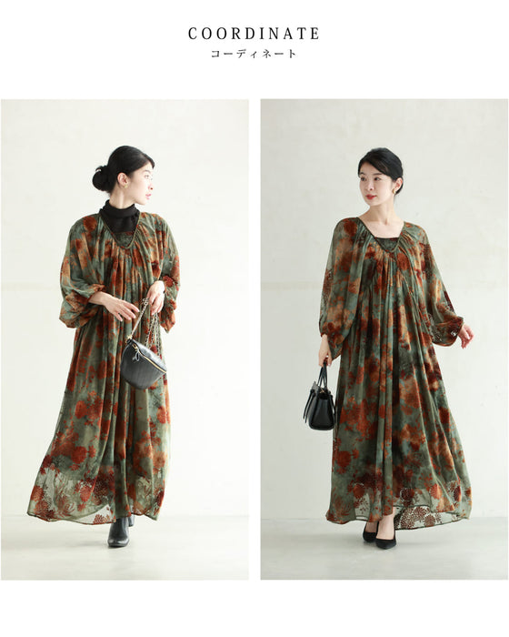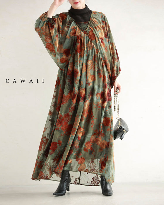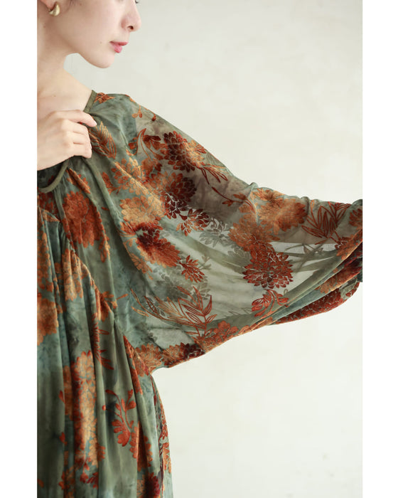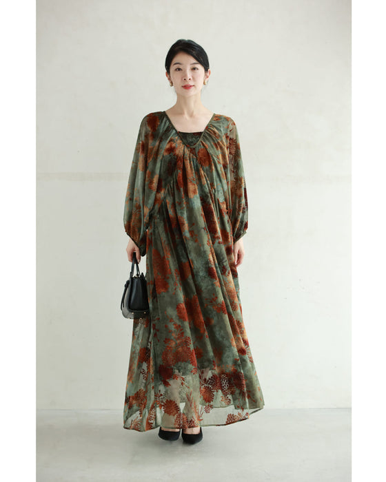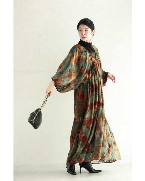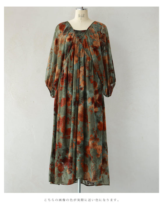 染まりゆく花が浮かぶふっくらバルーン袖ロングワンピース