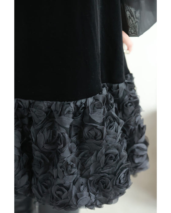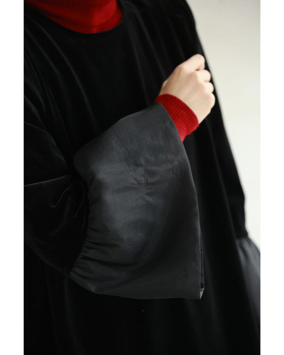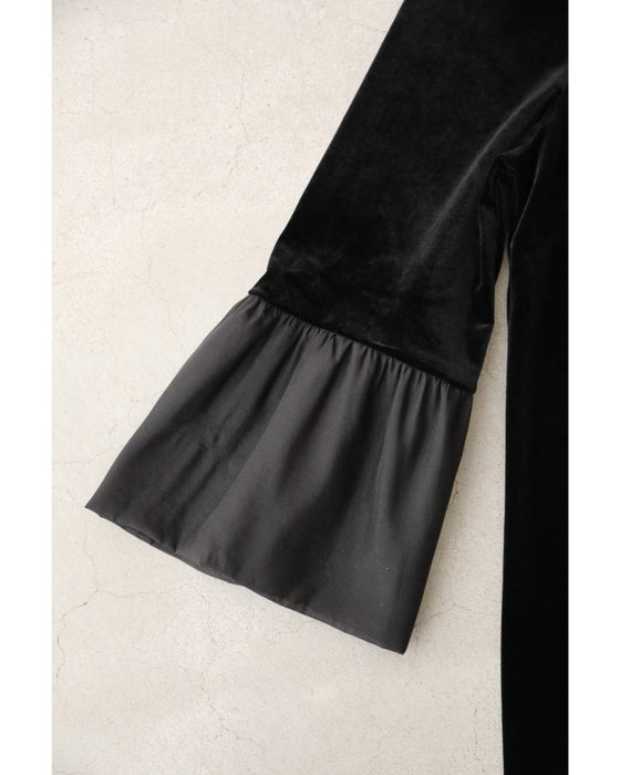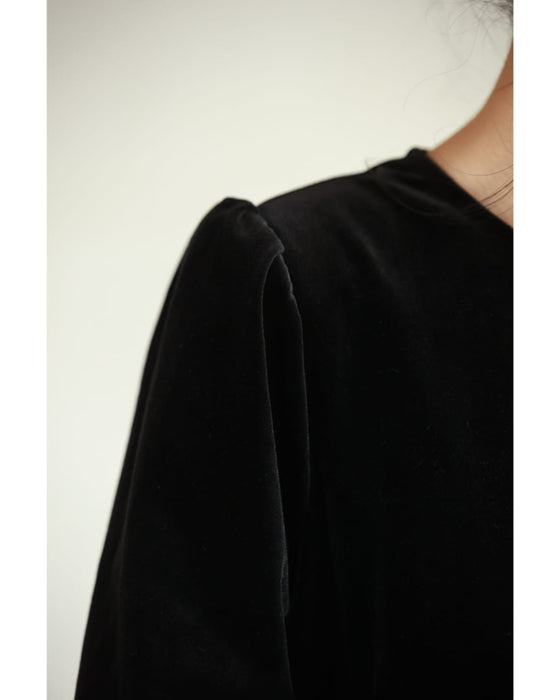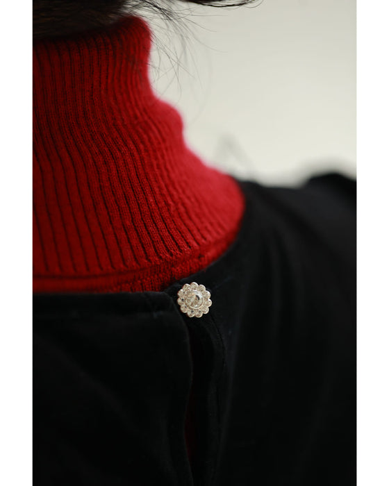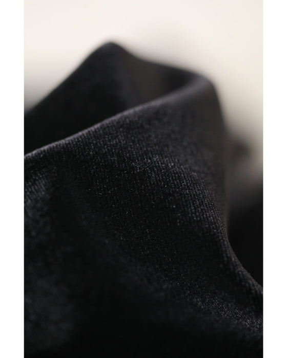 深い黒のベロア素材が、柔らかい光沢を放ち、シックでありながらも華やかさを兼ね備えています。特別な日のコーディネートにぴったりな、エレガントで洗練された一着です。
