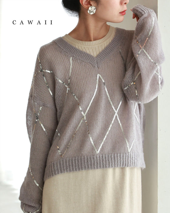 スパンコール連なるアーガイルラインニットプルオーバートップス