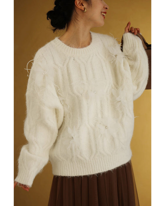 ハートビジューのふわふわチュール花ニットプルオーバートップス
