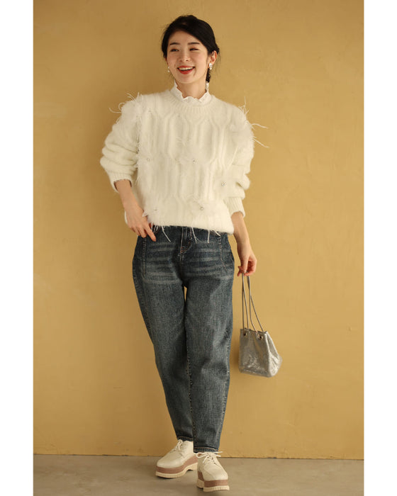 のニットの魅力的なポイントは、ふわふわの羽の装飾が施されていることです。羽のモチーフは、優雅さや可憐さを象徴し、装飾として華やかな印象を与えます。羽のデザインがニットに程よいアクセントをプラスし、他とは一味違う個性的なスタイルを演出してくれます。