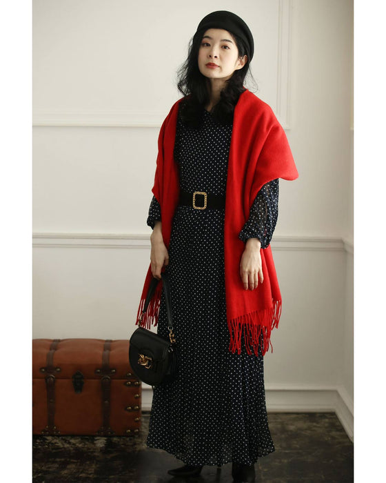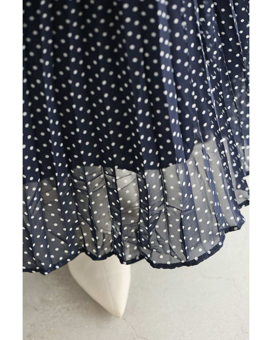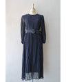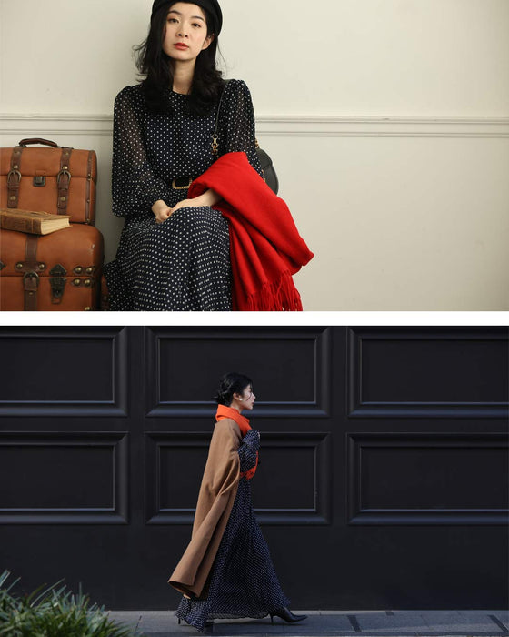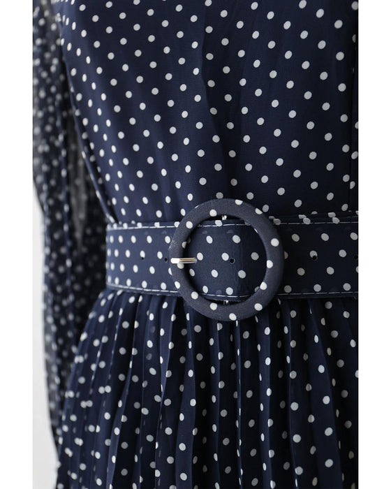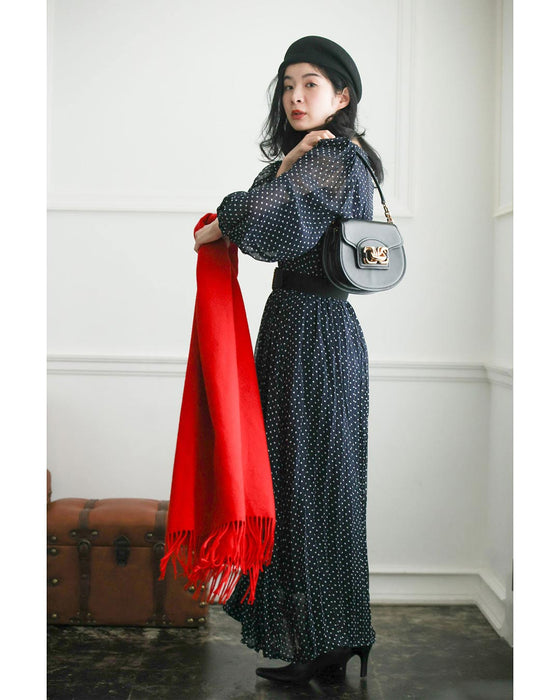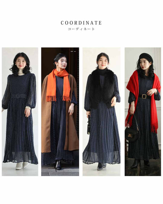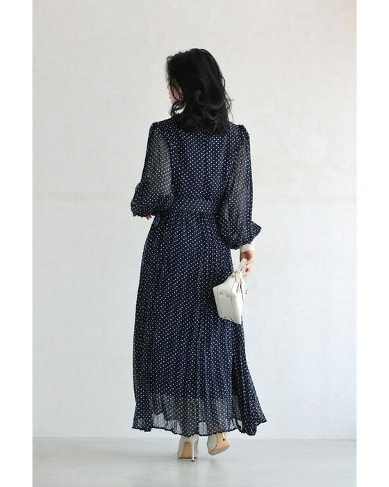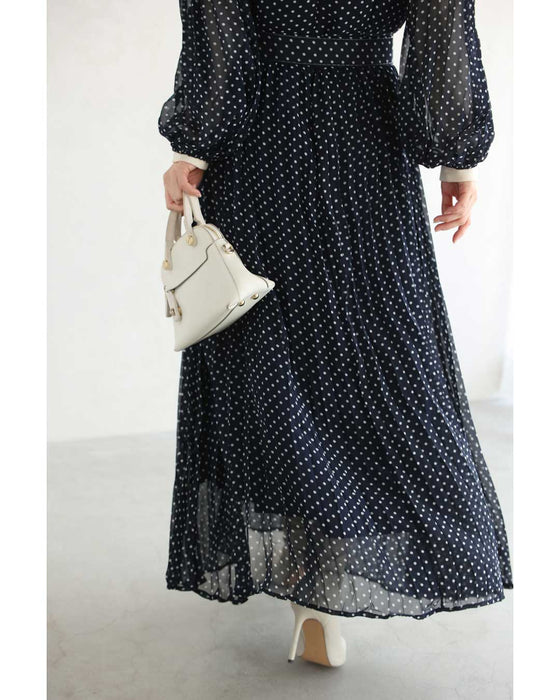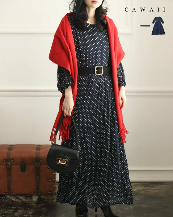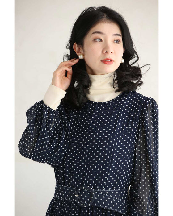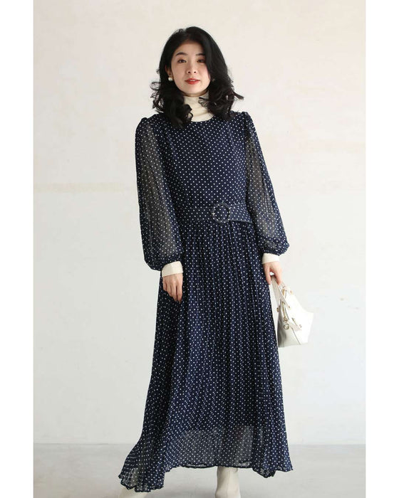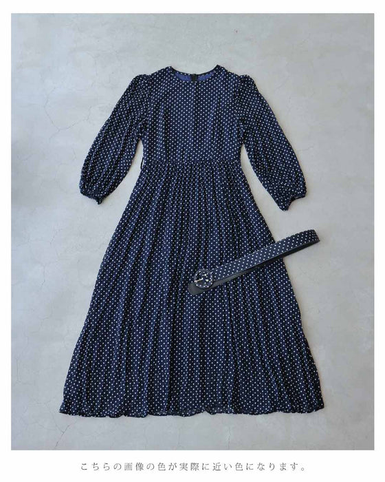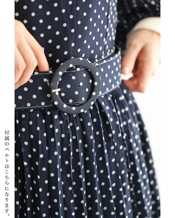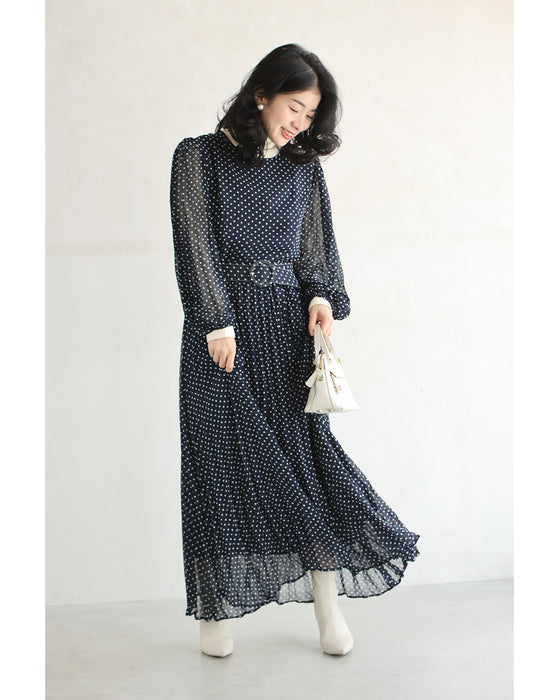 クラシカルなシアードットロングワンピース(ベルト付き)