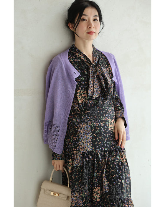 可憐に咲く小さな花模様が全体に散りばめられ、女性らしい華やかさを演出します。繊細な柄ながら、甘すぎず上品な印象を与えるデザインで、大人のフェミニンスタイルを叶えてくれる一着です。