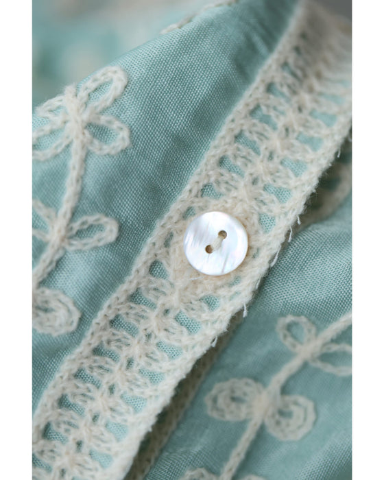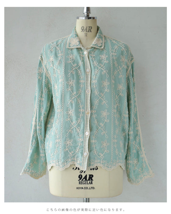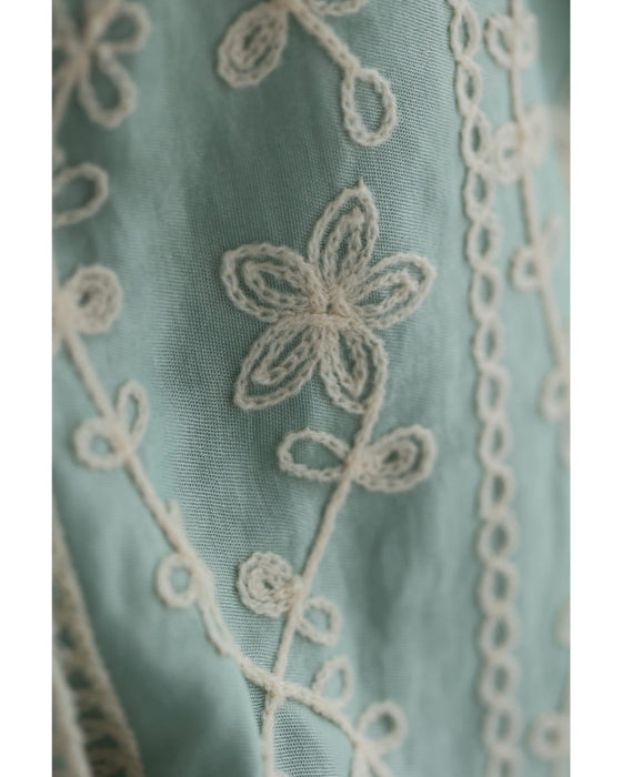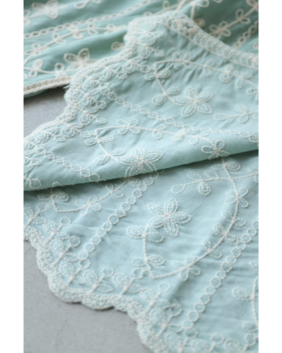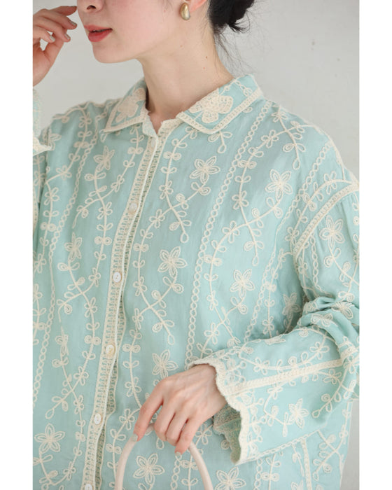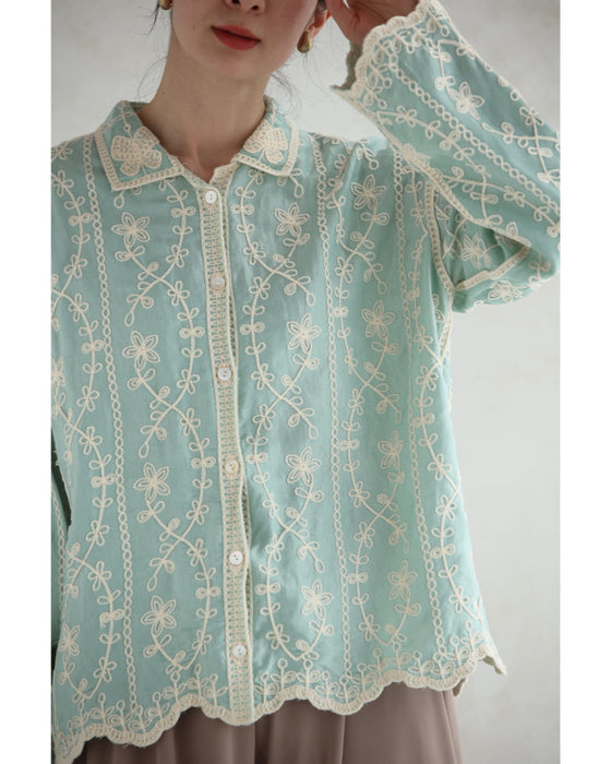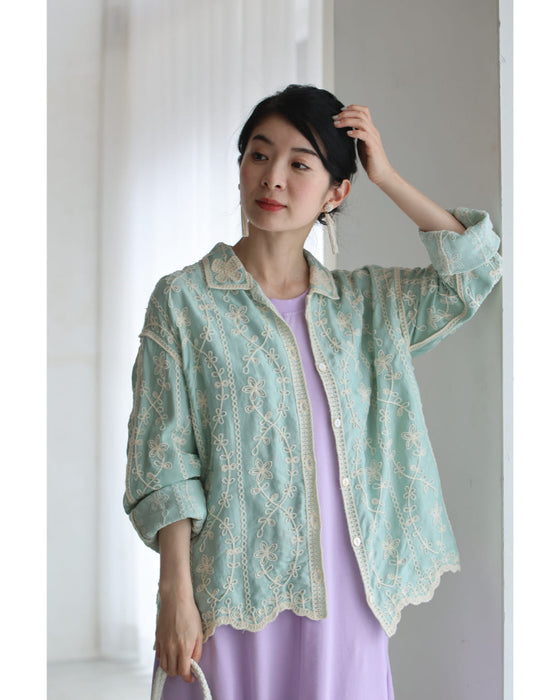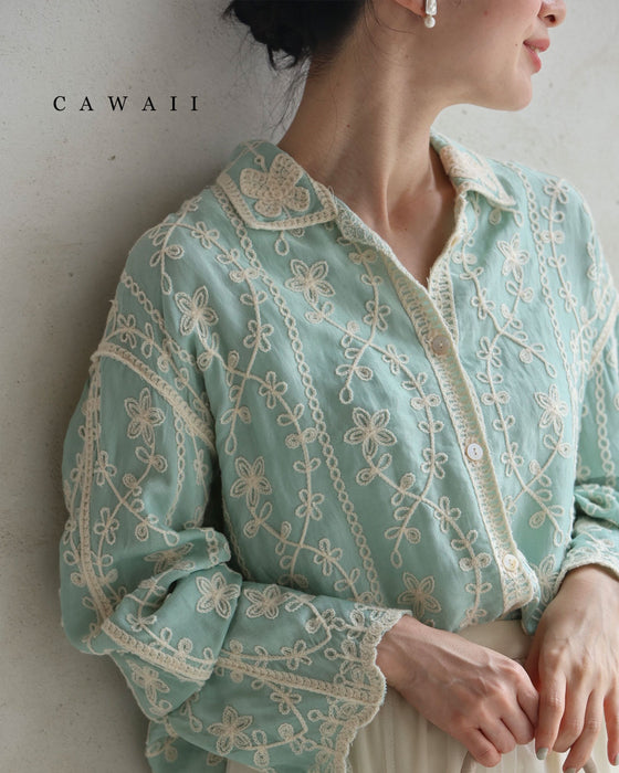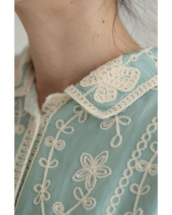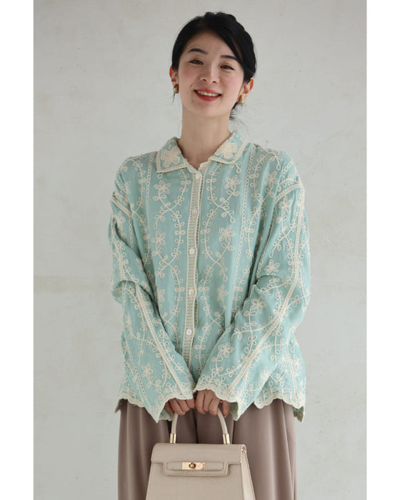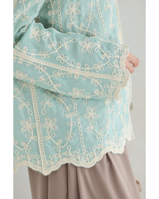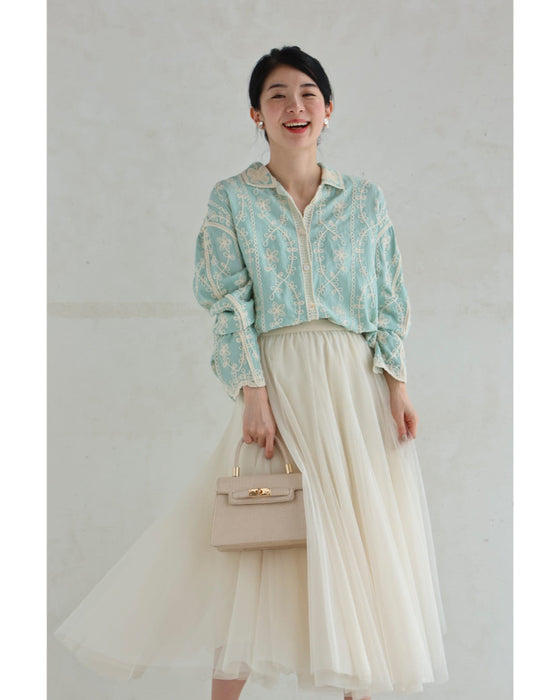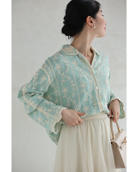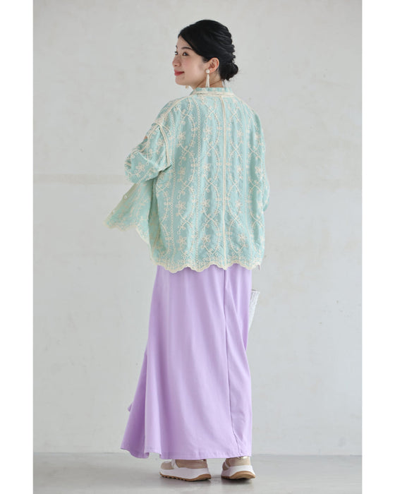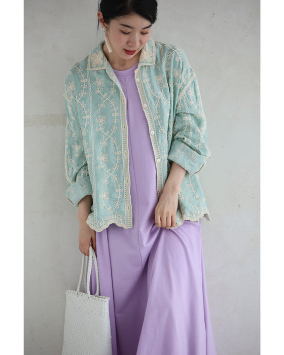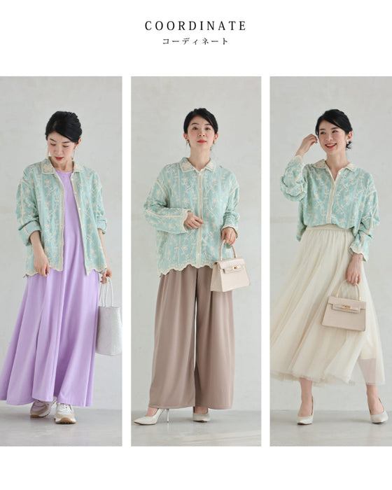 ミントグリーン×立体刺繍×ゆったりシルエットなら、程よい抜け感と上品さを両立できますね。