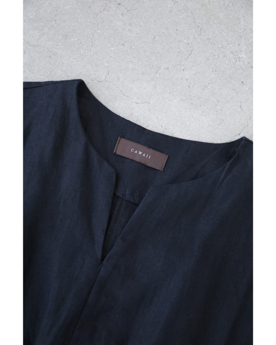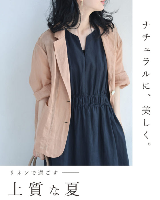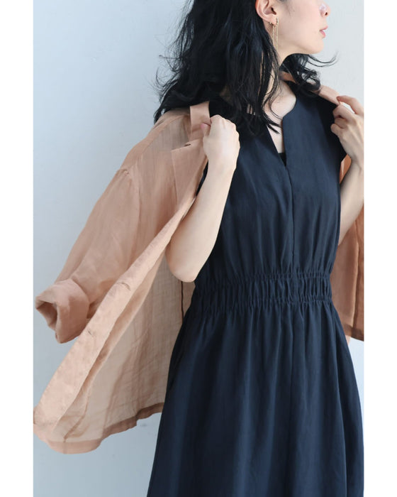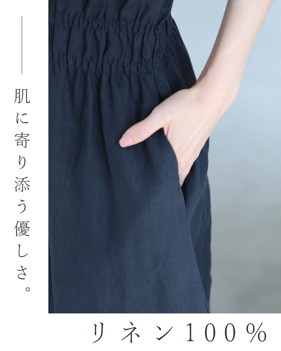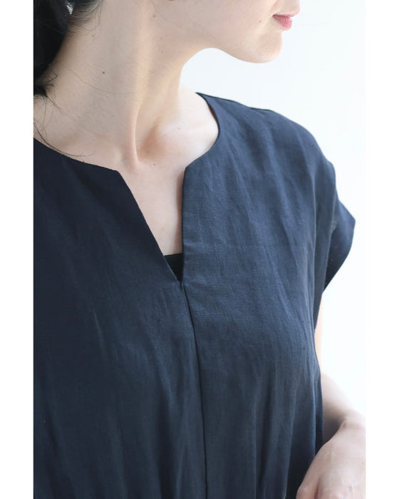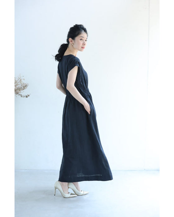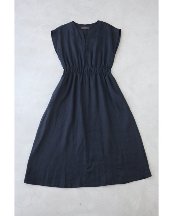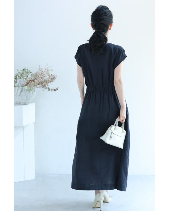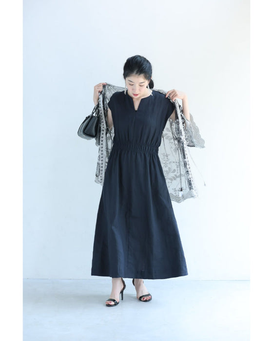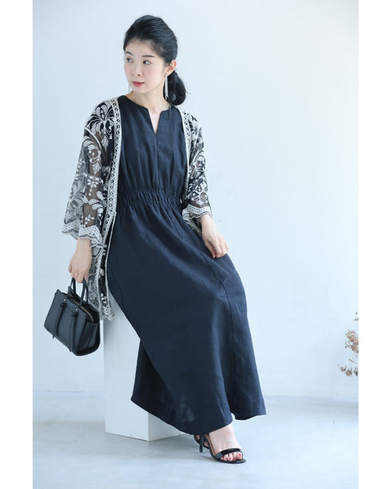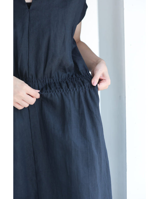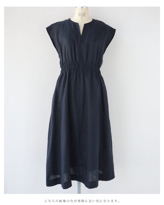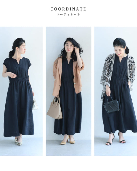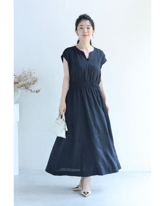 ウエストシェイプの涼しいキーネックリネンロングワンピース