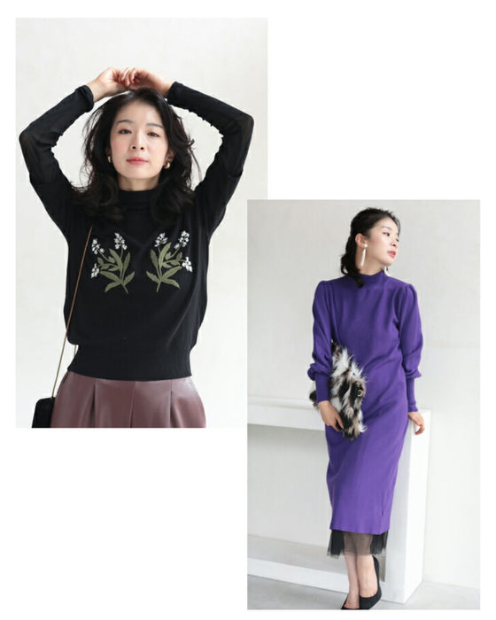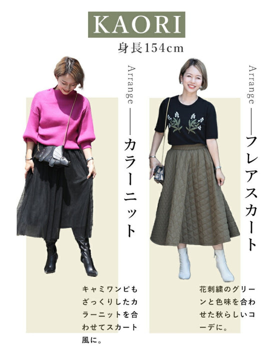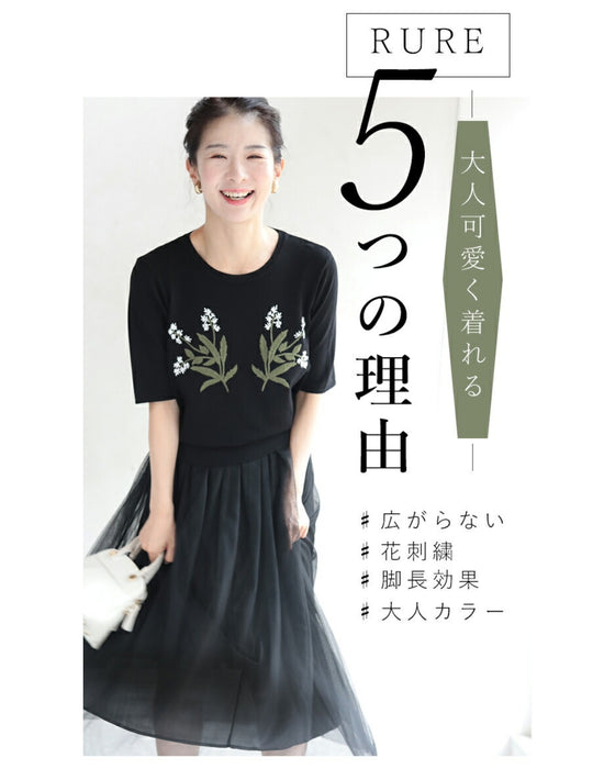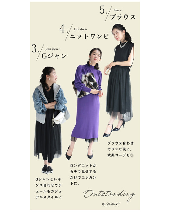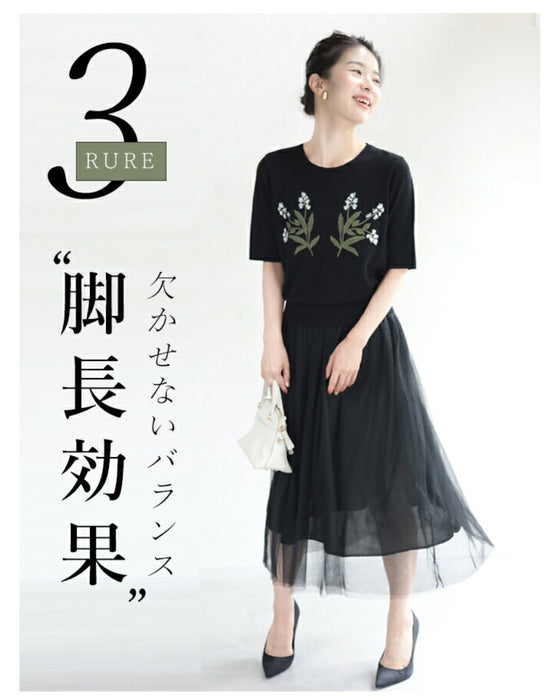 歩くたびにふんわり揺れてチュールの透け感が大人の女性らしい雰囲気のワンピースに、体にフィットするコンパクトな丈感の可愛らしいお花のトップスがバランスよい1枚です。