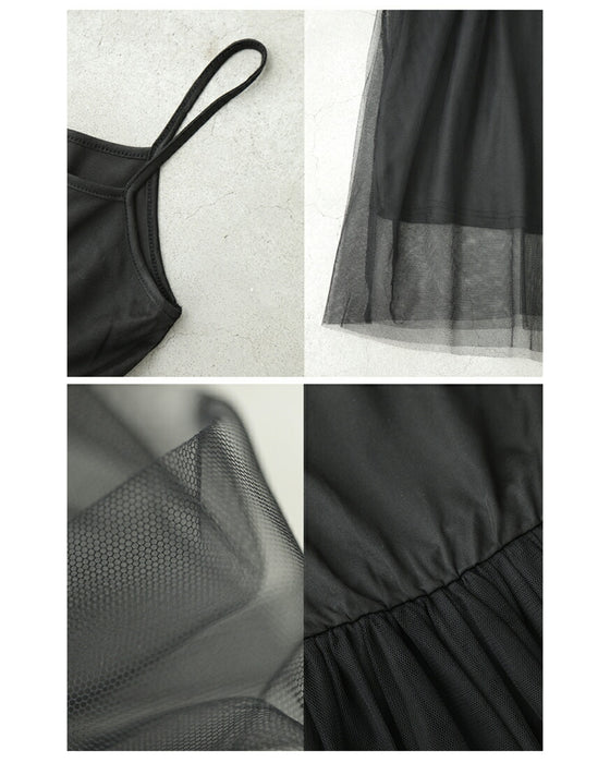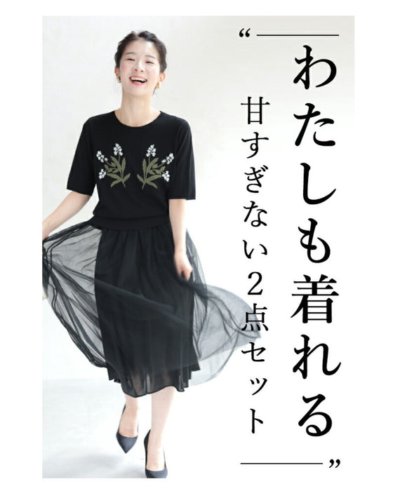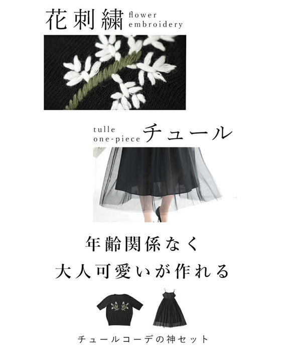 白いお花が可愛らしい花刺繍が施された半袖トップスと、ふんわり柔らかチュールスカートキャミソールワンピースのセットアップです。