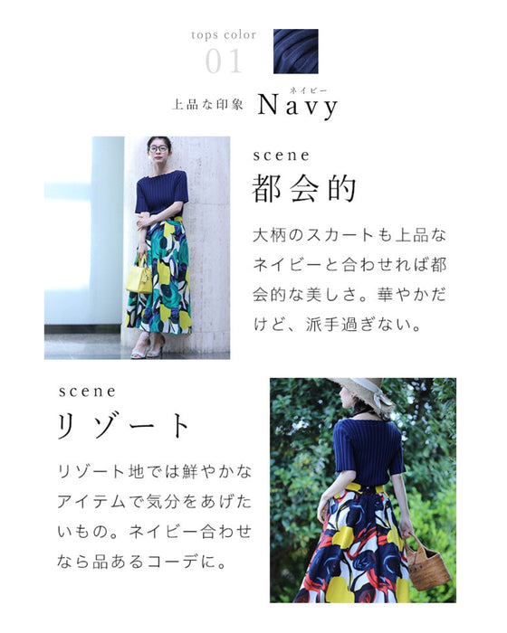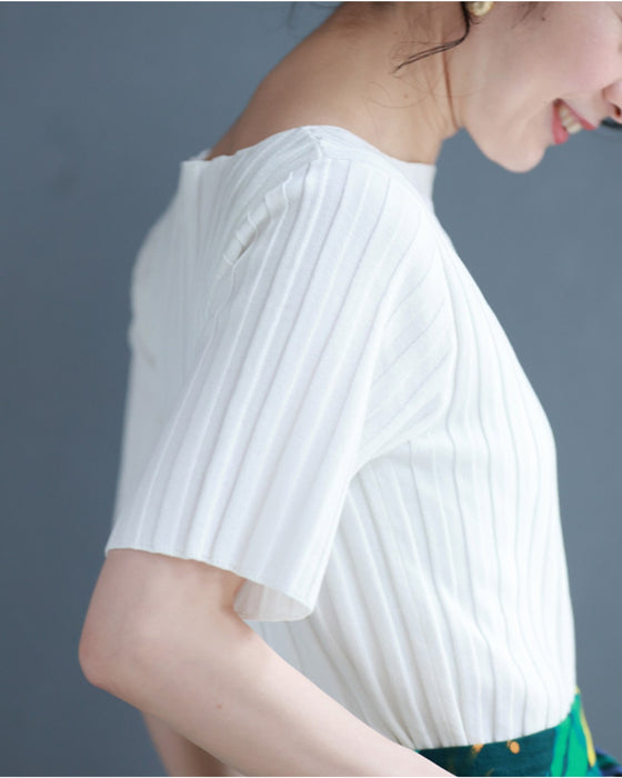 二の腕まで隠れる袖丈で上半身スッキリ♪ボートネックで首が詰まりすぎてないから首が細く長く見える!凸凹の縦ラインで細見え効果◎伸縮性のあるリブニットで着心地も楽々です。通気性の良い暑くないニット生地で長く愛用していただけます。