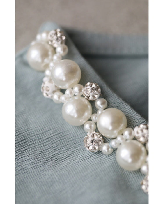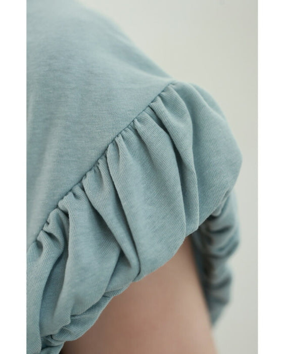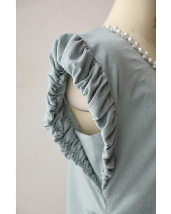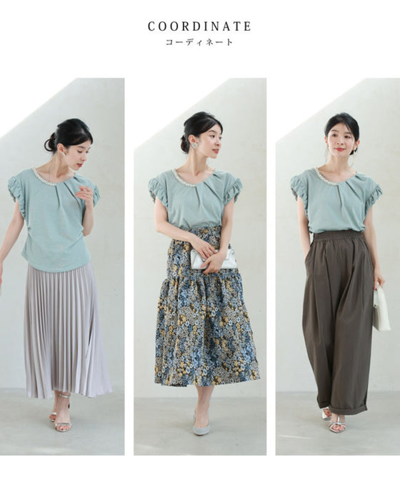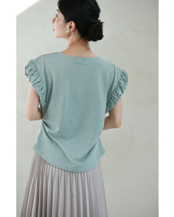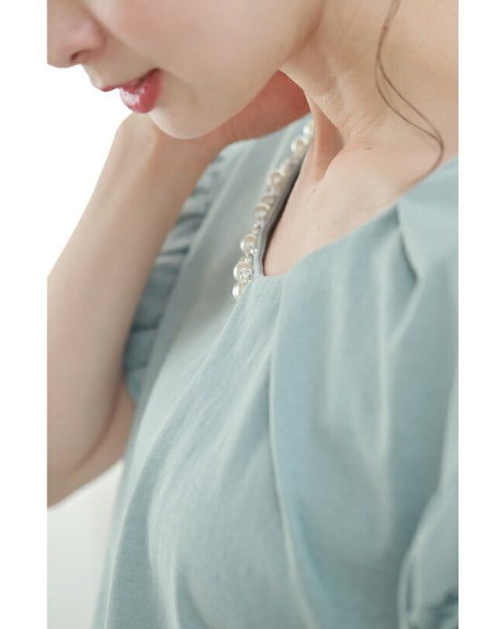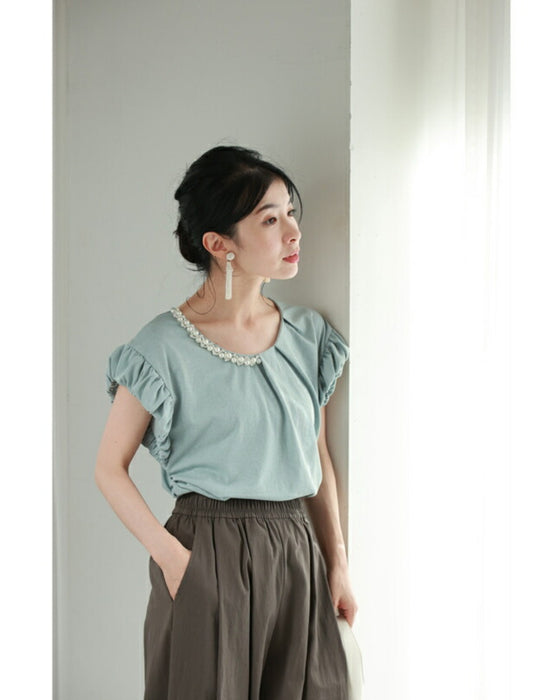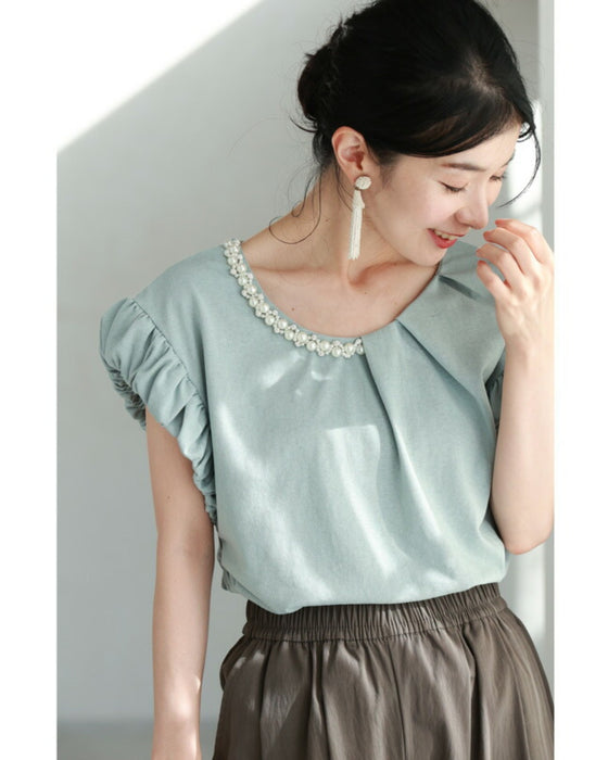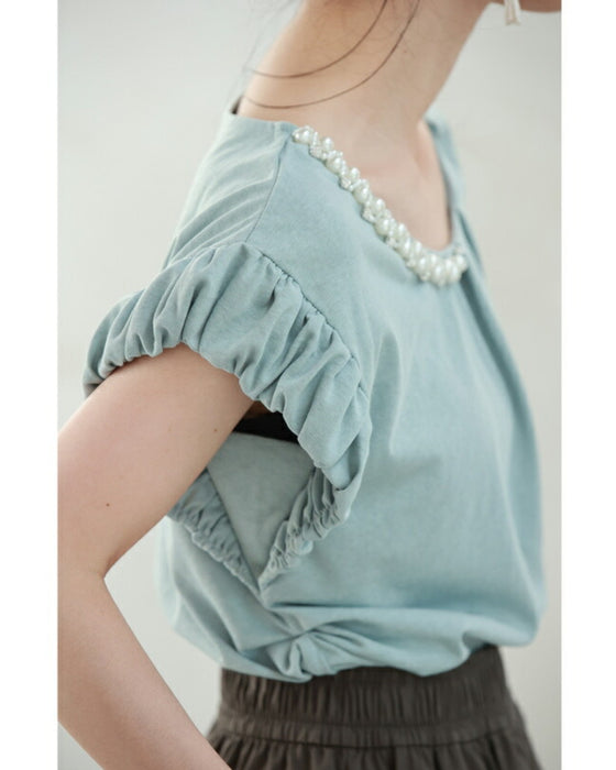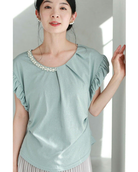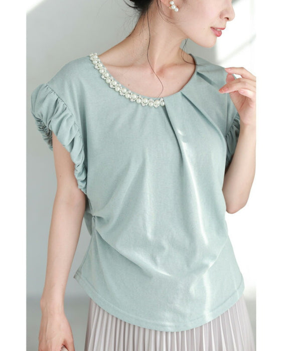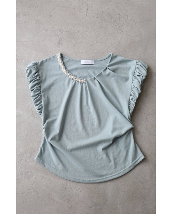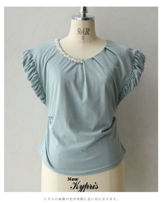 くしゅっとギャザー袖のハーフビジューネックTシャツトップス