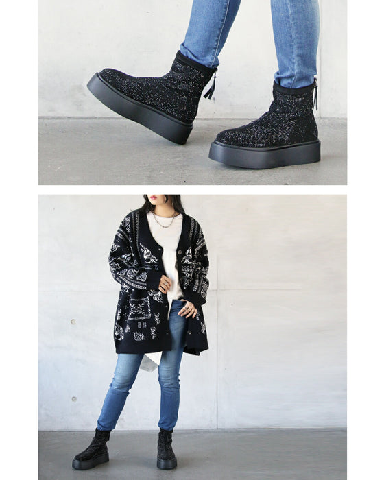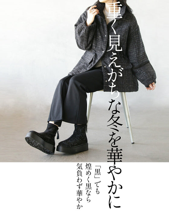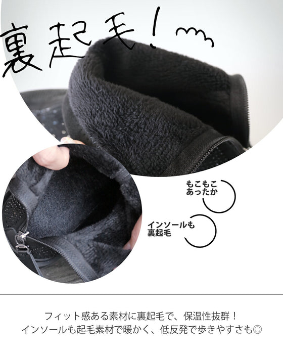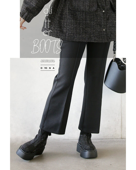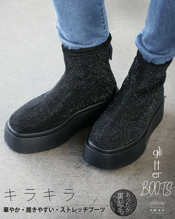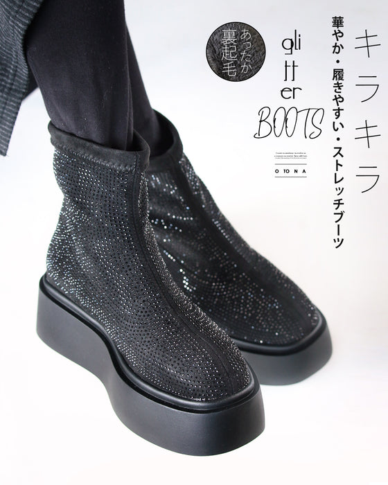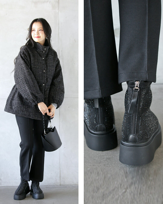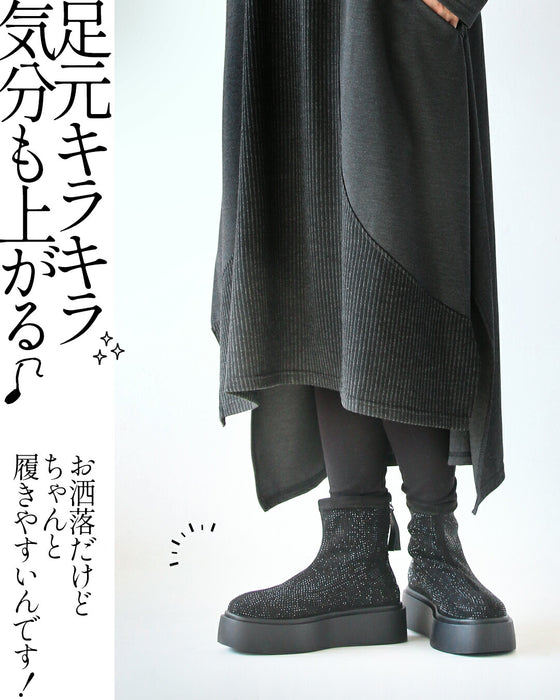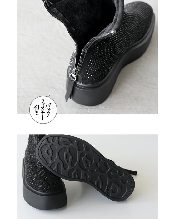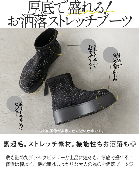 脚長効果のある厚底、ビジューでお洒落見えするのに、裏起毛とストレッチ素材で機能面も◎