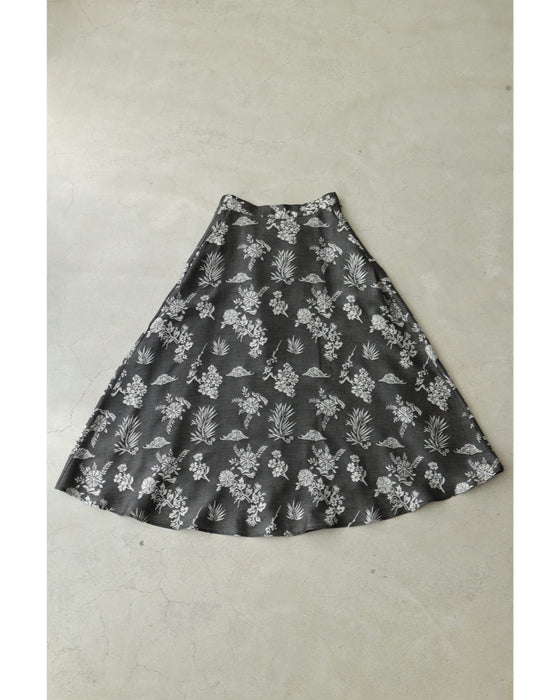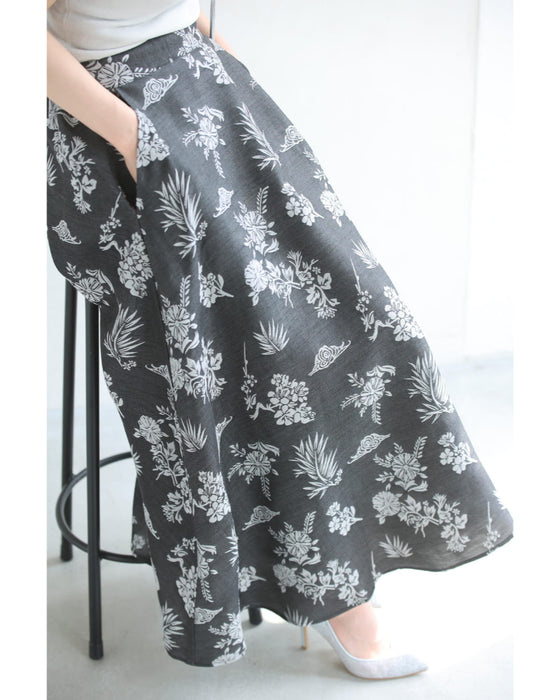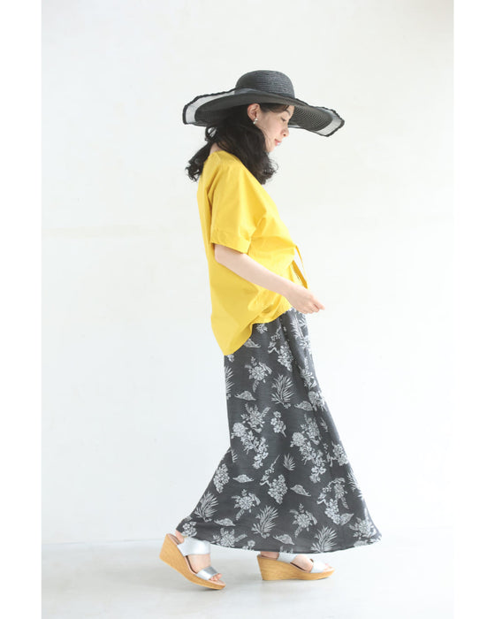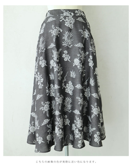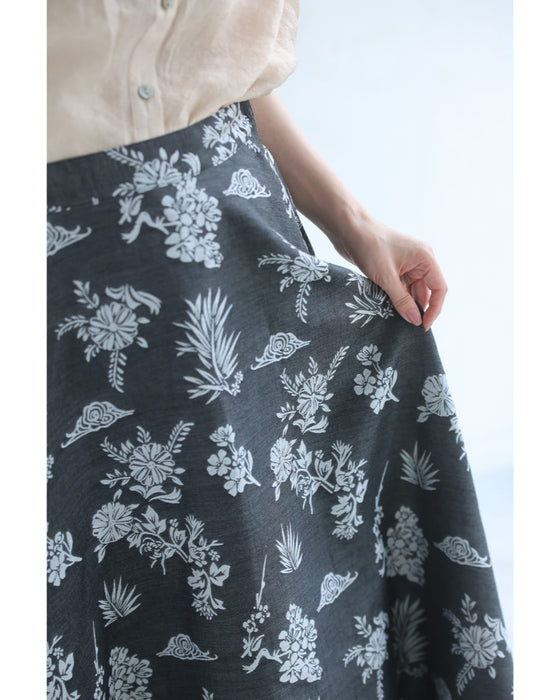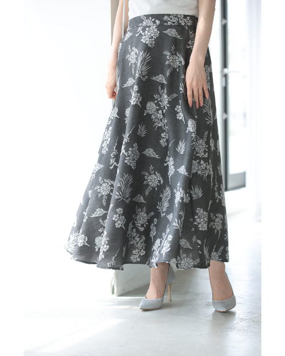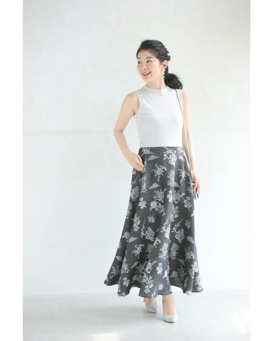 スカートはふわりと広がる美しいAラインシルエットで、歩くたびに優雅に揺れ、見る人の視線を惹きつける存在感。体型を自然にカバーしつつもすっきりと見せてくれる計算されたデザインです。