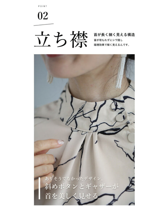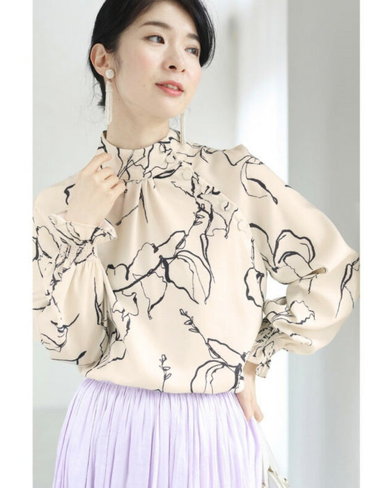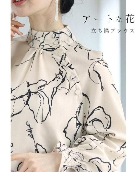 アートに描く花モチーフのスタンドネックブラウストップス